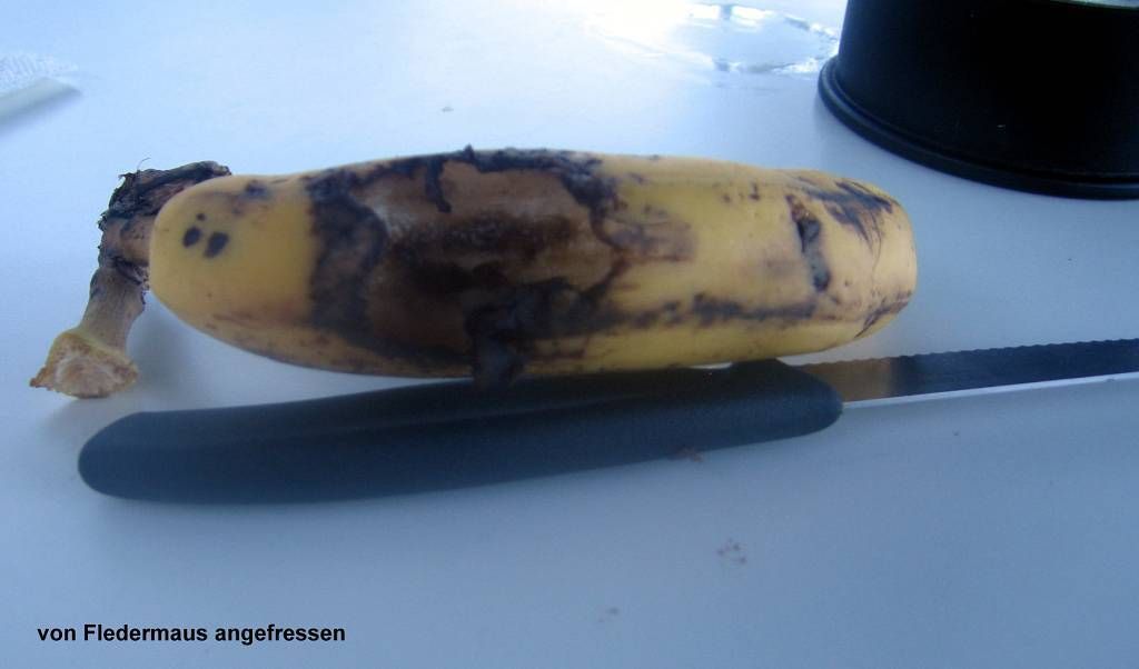 Ah, und jetzt wissen wir auch wer unsere Banane angefressen hat. Eine Fledermaus! Leena und Peter hatten schon das gleiche Problem. Wir stellen uns die Fledermaus vor, wie sie genüsslich an unserer Banane schmatzt, während wir nichtsahnend schlafen...