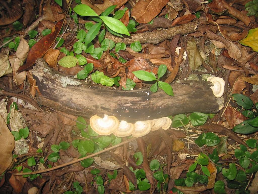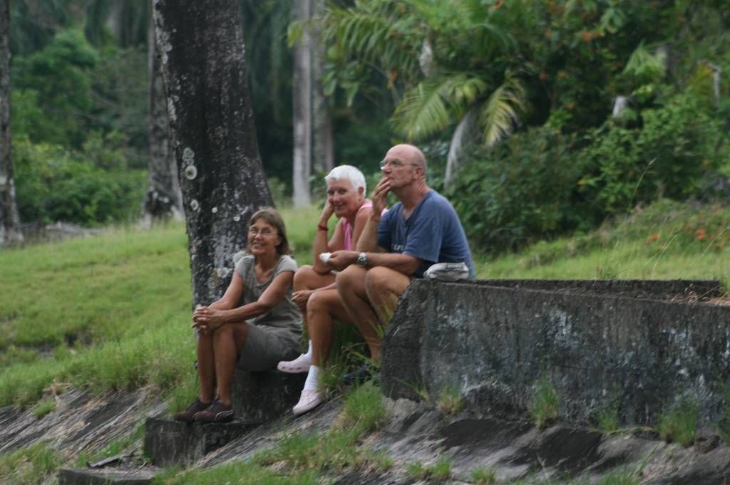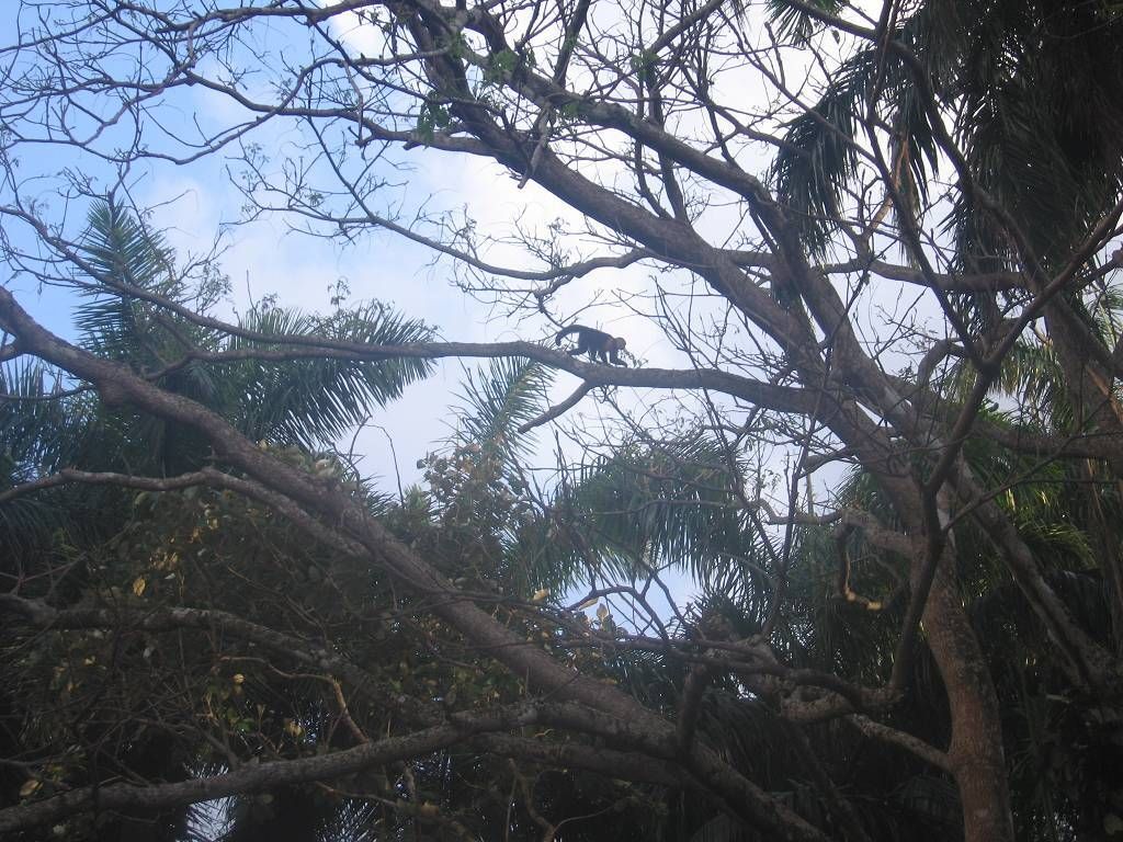 Um 17h brauchen wir ein wenig Bewegung. Wir machen einen kleinen Waldspaziergang und suchen Affen!!! Auf der anderen Seite des Waldes hören wir die unheimlichen Schreie der Brüllaffen. Und endlich finden wir auch ein paar Affen, aber keine Brüllaffen, sondern eine kleinere Sorte, von denen wir nicht wissen, wie sie heissen. Vielleicht eine Art Meerkatzen? Auf jeden Fall sitzen sie auf einem Baum, lassen sich von uns überhaupt nicht stören und knatschen genüsslich an irgendwelchen kleinen Früchten herum. Auf dem Rückweg sehen wir noch mehr von der Art. Diese sitzen auf einer Palme und spucken respektlos etwas wie Kirschensteine auf uns nieder. Aber wir freuen uns trotzdem, endlich mal ein paar Affen gesehen zu haben.