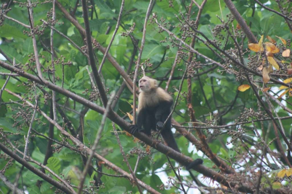 Auf dem Rückweg sitzen ganz hoch oben in den Baumkronen nochmals ein paar von den Meerkatzen. Sie haben hellbraune Gesichtlein und oberen Brustbereich, der Rest ist schwarz. Ich habe mich im Internet schlau gemacht und es sind doch Affen. Sie heissen Weissschulterkapuziner.