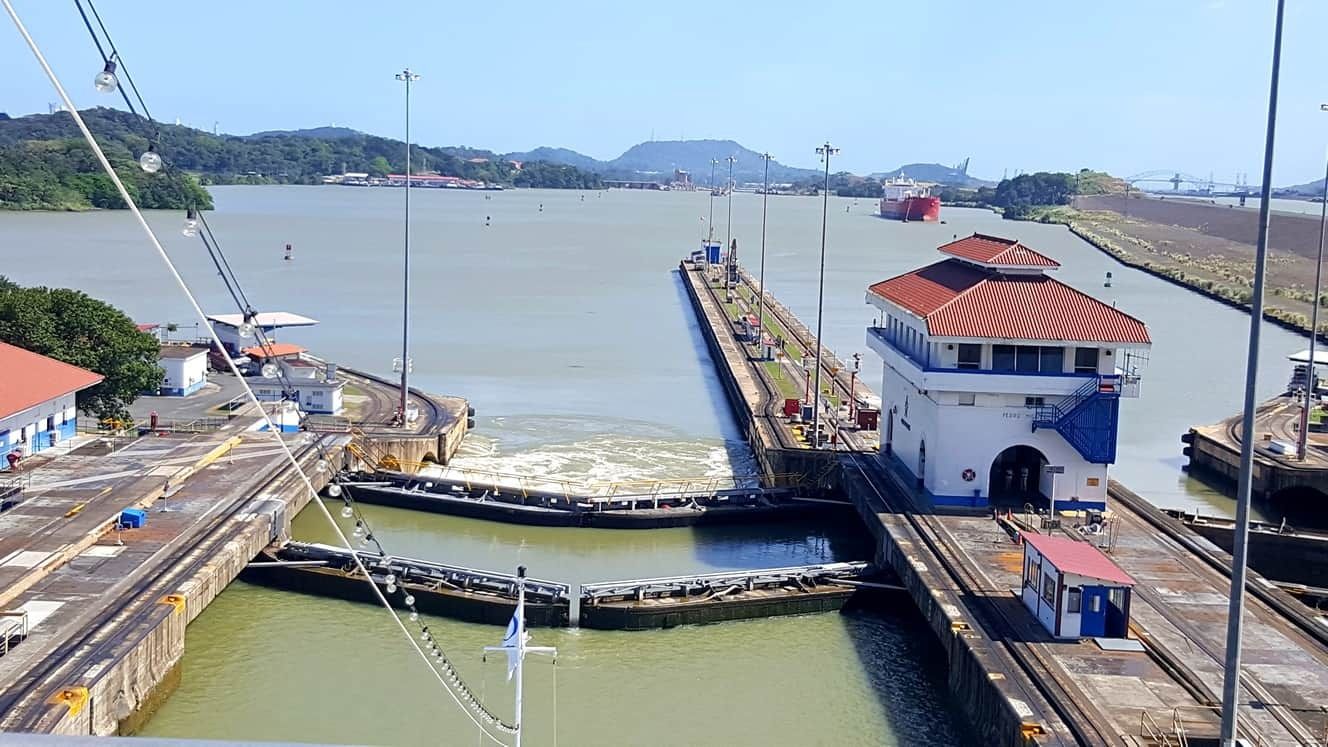 Heribert sagt Amado (so heisst der Neue), dass wir ALLEINE durch die nächsten Schleusen wollen. Amado ist einverstanden und wir dürfen die Abkürzung durch den Banana-Kanal nehmen, um schneller über den Gatun-See zu kommen. Gegen 11h sind wir in der Pedro Miguel Schleuse, ganz alleine!!! Kein Riesenkahn vor oder hinter uns. Paul sitzt am Steuer, weil er ja verletzt ist. Er bibert ganz schön, mit einem fremden, 47-Fuss-Schiff zu fahren. Aber er macht das prima! Heribert hilft als Linehandler. Er und ich sind am Heck, Hildegard und Fritz am Bug. Alles läuft ganz ruhig und geordnet ab. Amado gibt klare und präzise Befehle. So soll es doch sein! Nur bei Fritz finden wir den Abstellschalter nicht, er quatscht und quatscht ohne Ende....