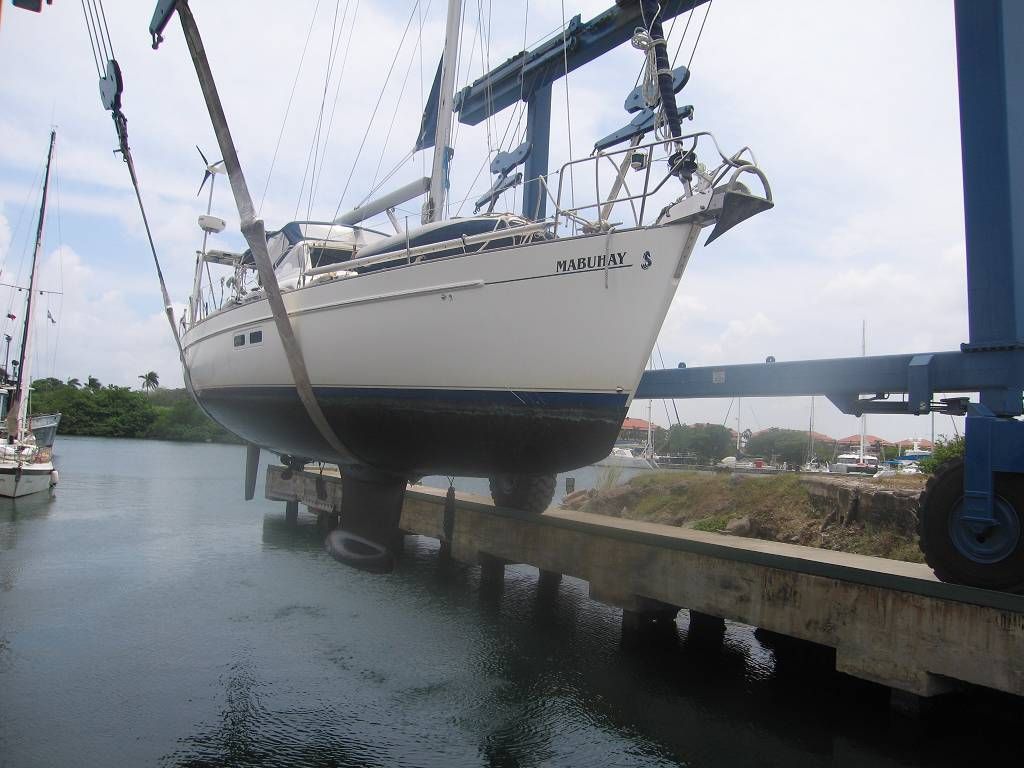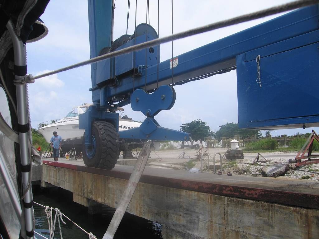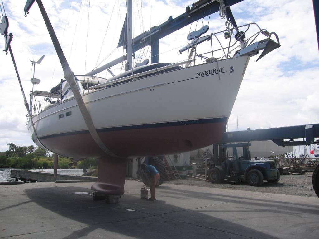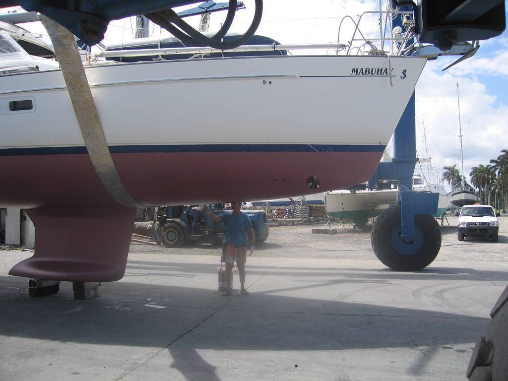 Paul streicht um 6h30 schon wieder an der MABUHAY weiter. Besonders die Wasserlinie und der Bug werden von ihm ein paar Mal angestrichen. Dave sagt uns um 8h, wir kämen gleich an den Kran. Aber zuerst muss ich noch ins Marina-Büro, um den Rest der Rechnung für's „an Land - Stehen“ bezahlen. Das ist ein wenig gemein hier in dieser Marina, wir mussten pro Tag an dem wir selber am Schiff gearbeitet haben 31.50 $ bezahlen. Da wird man also bestraft dafür, dass man nicht zu faul ist, die Arbeit selber zu machen. Ausserdem kostet es pro Nacht, die man in der Werft im Schiff übernachtet, zusätzlich 10 $. Dabei bezahlen wir gleichzeitig auch noch den Liegeplatz im Wasser weiter.