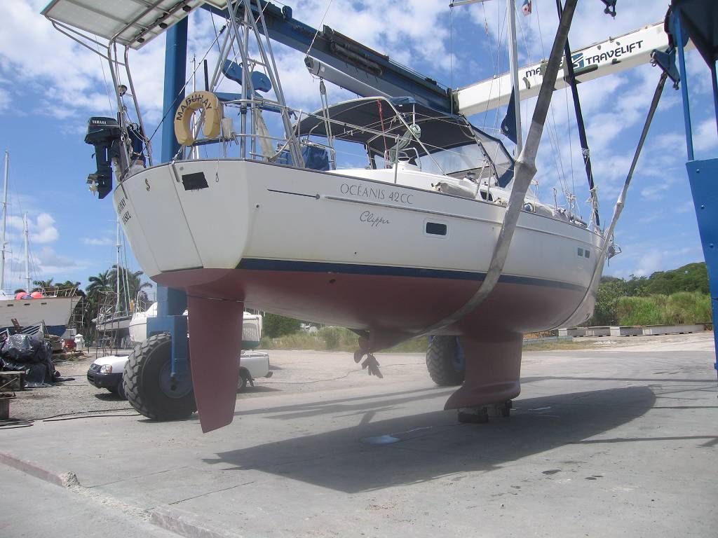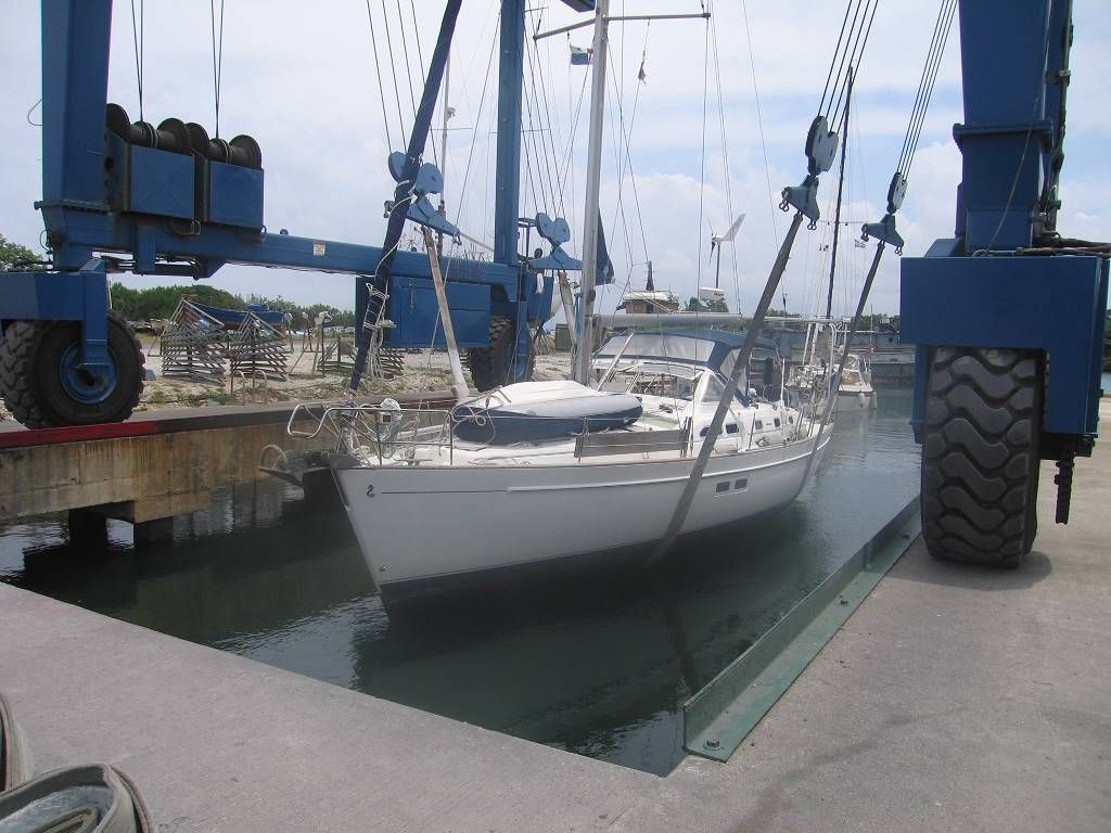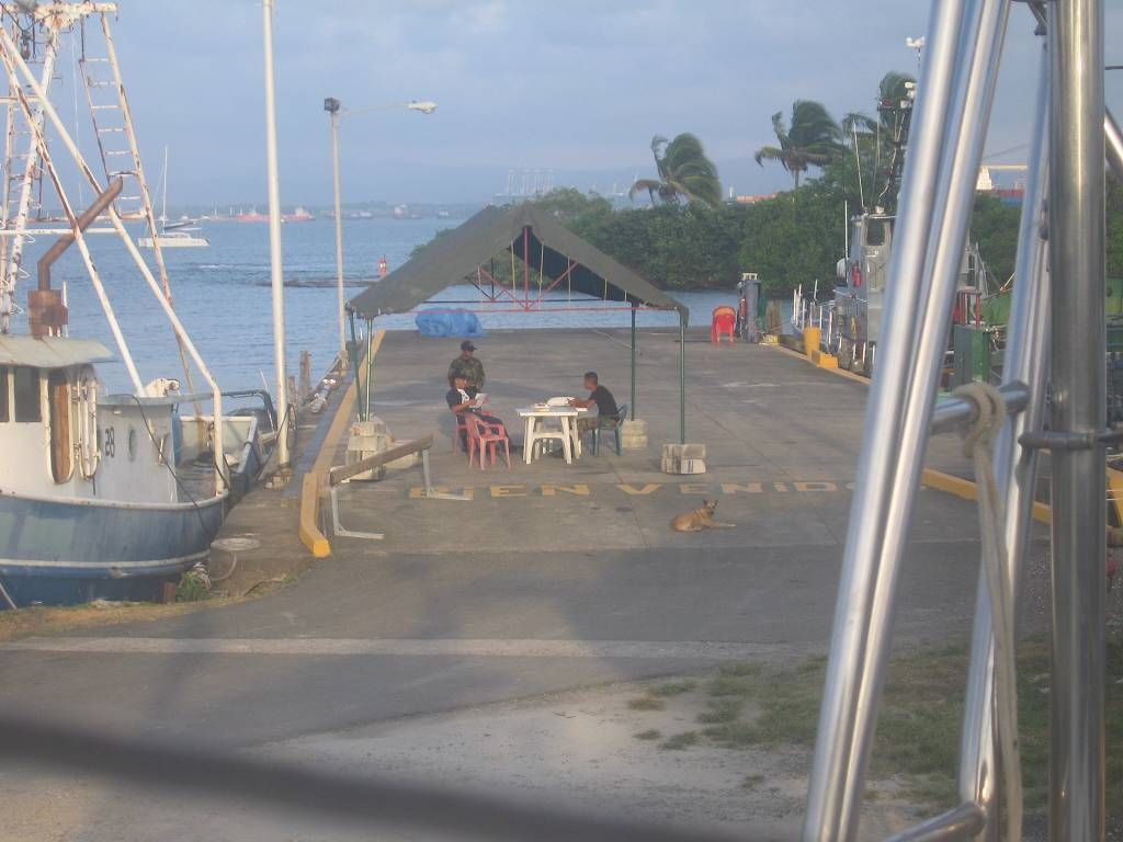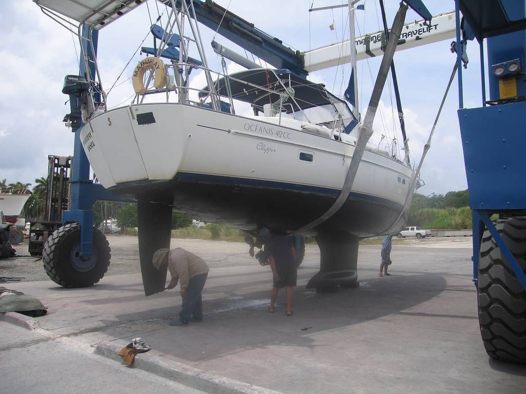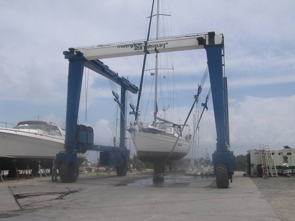 Paul streicht um 6h30 schon wieder an der MABUHAY weiter. Besonders die Wasserlinie und der Bug werden von ihm ein paar Mal angestrichen. Dave sagt uns um 8h, wir kämen gleich an den Kran. Aber zuerst muss ich noch ins Marina-Büro, um den Rest der Rechnung für's „an Land - Stehen“ bezahlen. Das ist ein wenig gemein hier in dieser Marina, wir mussten pro Tag an dem wir selber am Schiff gearbeitet haben 31.50 $ bezahlen. Da wird man also bestraft dafür, dass man nicht zu faul ist, die Arbeit selber zu machen. Ausserdem kostet es pro Nacht, die man in der Werft im Schiff übernachtet, zusätzlich 10 $. Dabei bezahlen wir gleichzeitig auch noch den Liegeplatz im Wasser weiter.