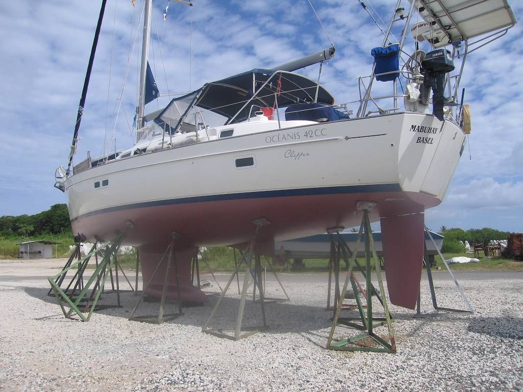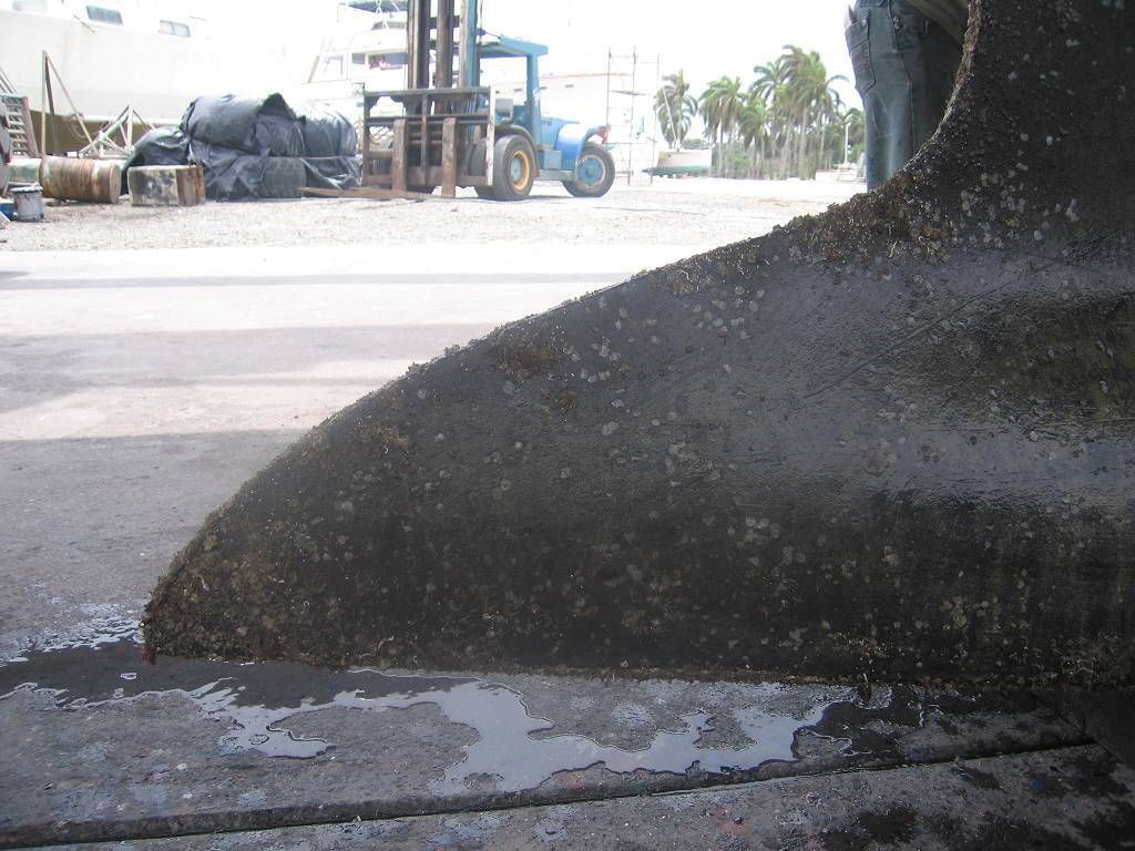 Endlich, so gegen 10h40 kommt die MABUHAY in die Gurten und hängt nun in der Luft, so dass wir die Stellen wo die 16 Stützen waren, abspachteln, schleifen und zweimal anstreichen können. Wir streichen die ganze Farbe die wir haben an, 5 US-Gallonen, (1 US-Gallone = 3,7853 Liter). Danach gibt man uns bis um 12h Zeit, um die Farbe trocknen zu lassen und um schnell etwas zu essen. Um 12h15 ist die MABUHAY wieder im Wasser und wir kommen an den Platz D 45.