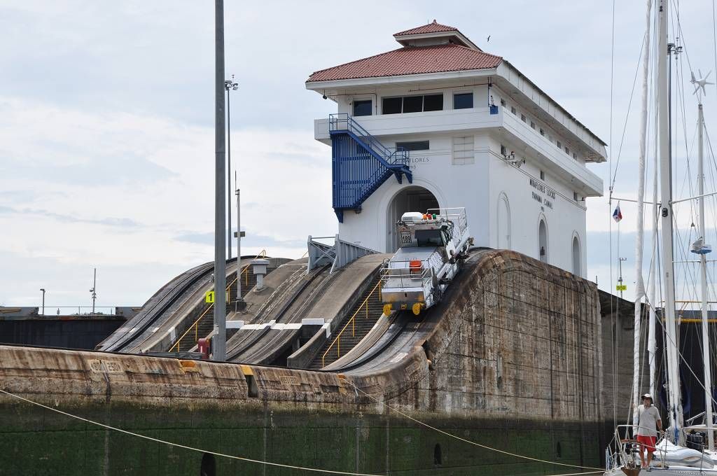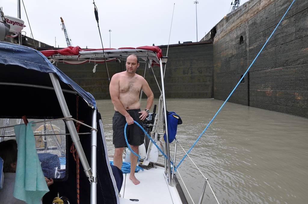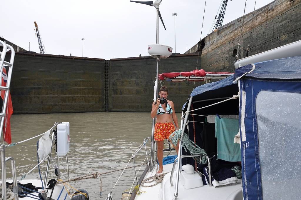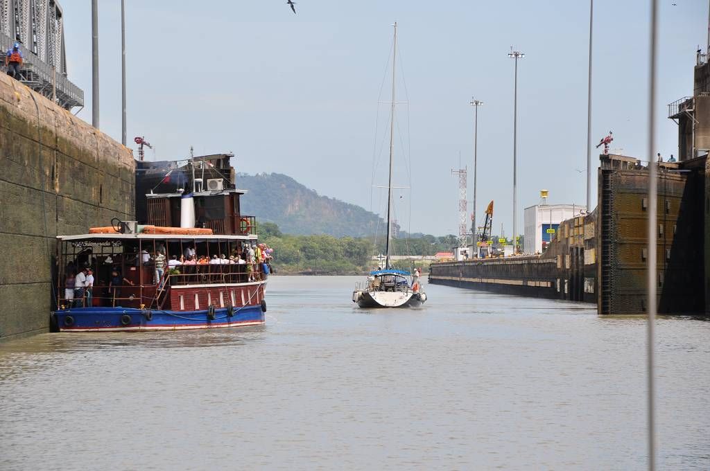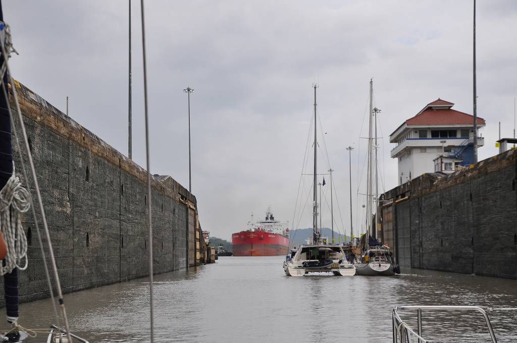 Und tatsächlich, als wir bei der Pedro Miguel Schleuse eintreffen, warten alle anderen 5 Schiffe auf uns, sie waren viel zu früh hier. Wir werden gleich wie gestern als Paket verschnürt. Der Katamaran Promise (USA) ist in der Mitte, das Mono-Segelschiff „Hobo“ (Kanada) ist auf der rechten Seite davon und wir links. Alle drei Schleusen passieren wir total problemlos. Auf dem Katamaran hinter uns gibt es in der ersten Miraflores Schleuse, da wo die Webcam ist, einen Unfall. Ein Mann wird mit blutiger Hand an Land gesetzt und von einer Ambulanz abgeholt. Was genau passiert ist, wissen wir nicht.