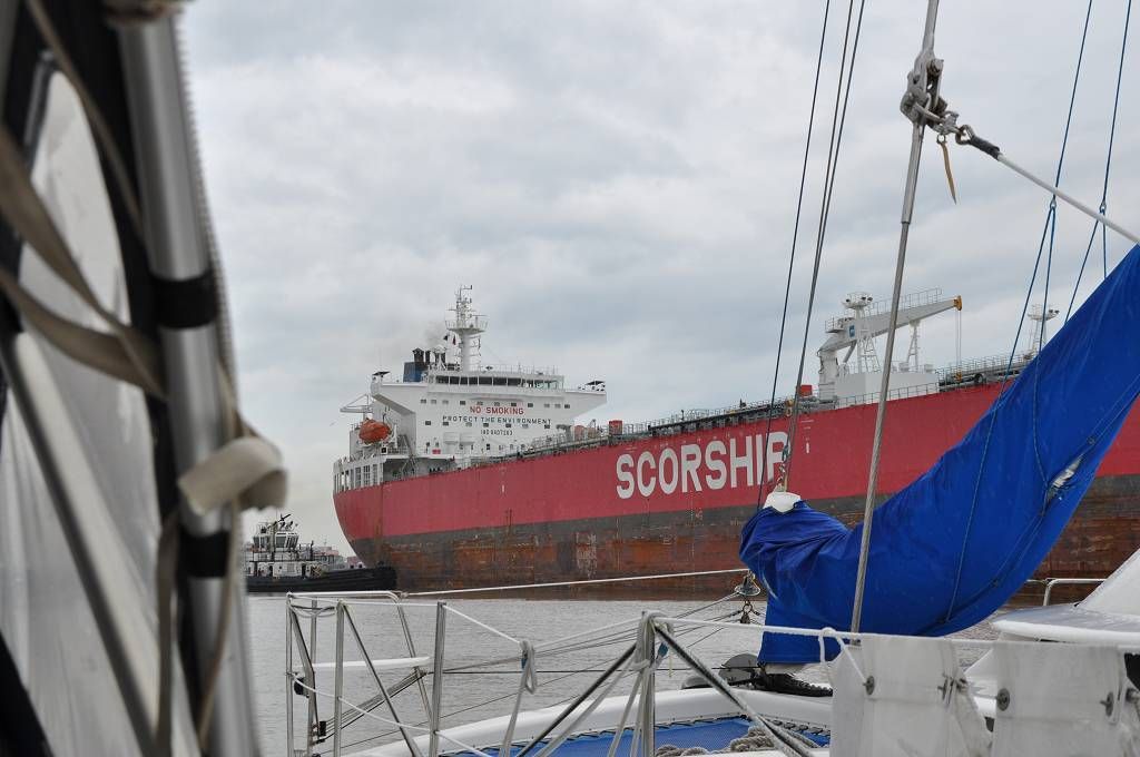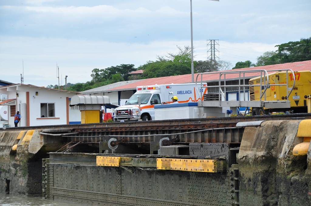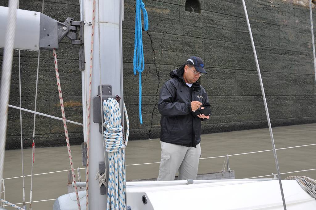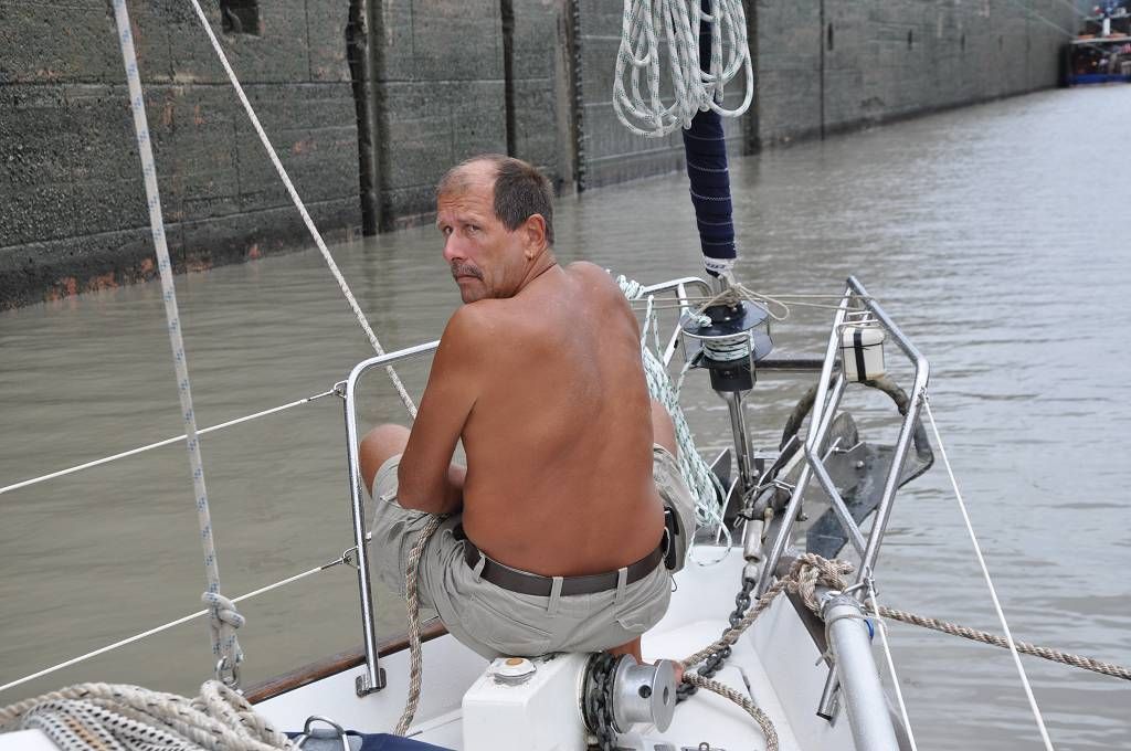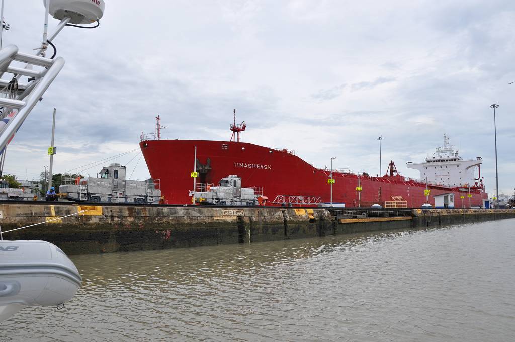 Und tatsächlich, als wir bei der Pedro Miguel Schleuse eintreffen, warten alle anderen 5 Schiffe auf uns, sie waren viel zu früh hier. Wir werden gleich wie gestern als Paket verschnürt. Der Katamaran Promise (USA) ist in der Mitte, das Mono-Segelschiff „Hobo“ (Kanada) ist auf der rechten Seite davon und wir links. Alle drei Schleusen passieren wir total problemlos. Auf dem Katamaran hinter uns gibt es in der ersten Miraflores Schleuse, da wo die Webcam ist, einen Unfall. Ein Mann wird mit blutiger Hand an Land gesetzt und von einer Ambulanz abgeholt. Was genau passiert ist, wissen wir nicht.