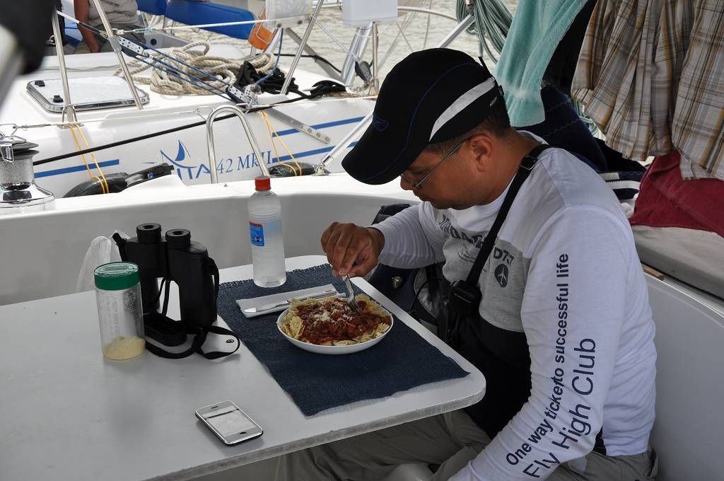 Um 13h30 erblickt die MABUHAY den Pazifischen Ozean. Bei der Centenario Brücke regnet es kurz. Astro bekommt als Mittagessen einen mächtigen Teller voll Farfalle mit Hackfleisch, von gestern Abend. Um 14h wollen wir beim Balboa Yachtclub unsere 12 Autoreifen und die 4 Leinen abgeben. Die wollen jetzt plötzlich 12$ für's Abgeben haben, dabei hat uns Agent Erick ausdrücklich gesagt, das koste nichts. Wir bezahlen nichts und schmeissen die Sachen einfach in das offene Motorboot.