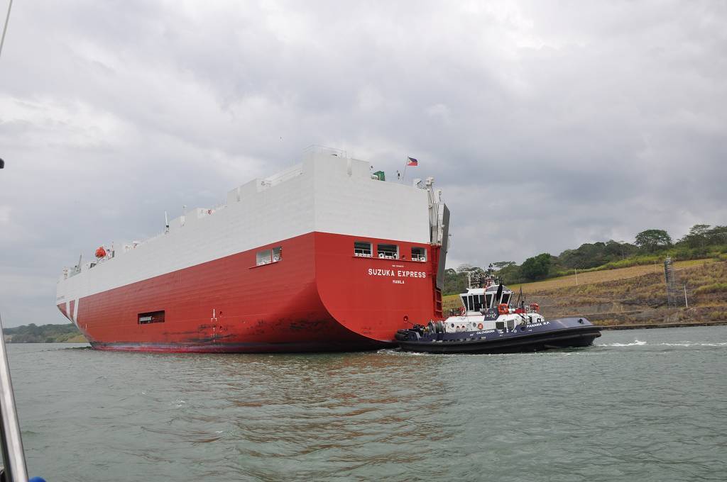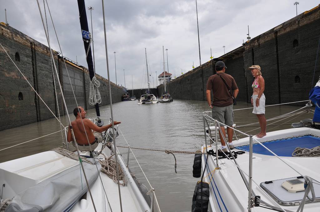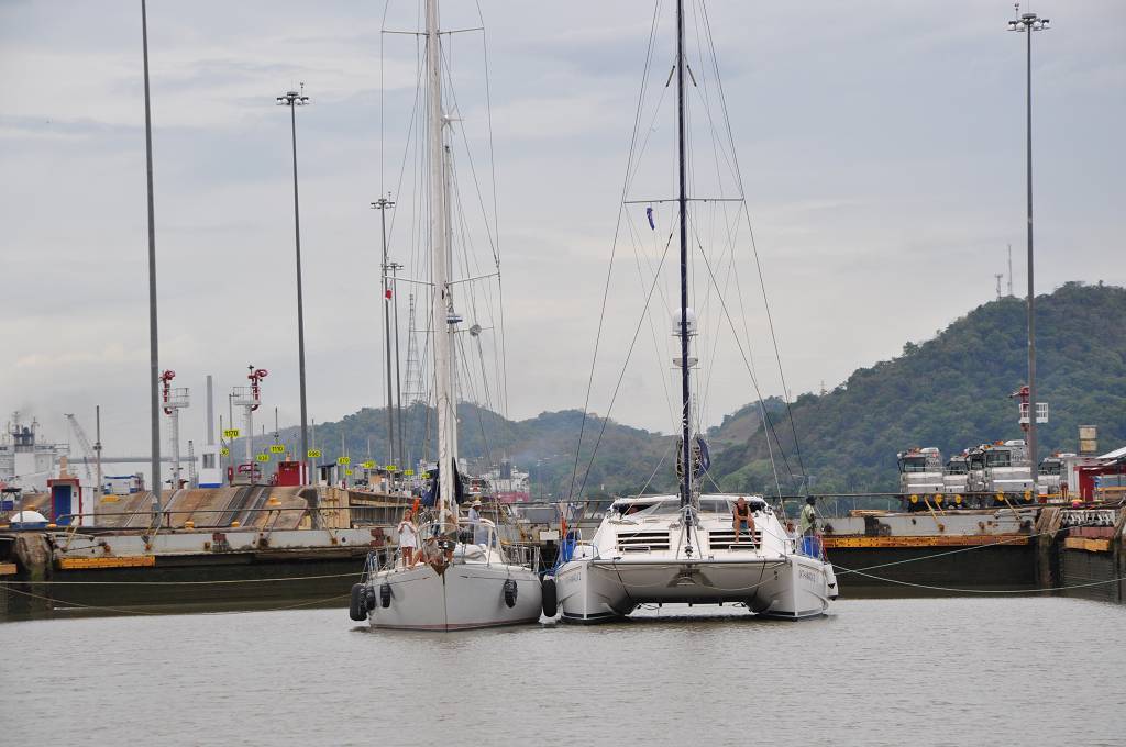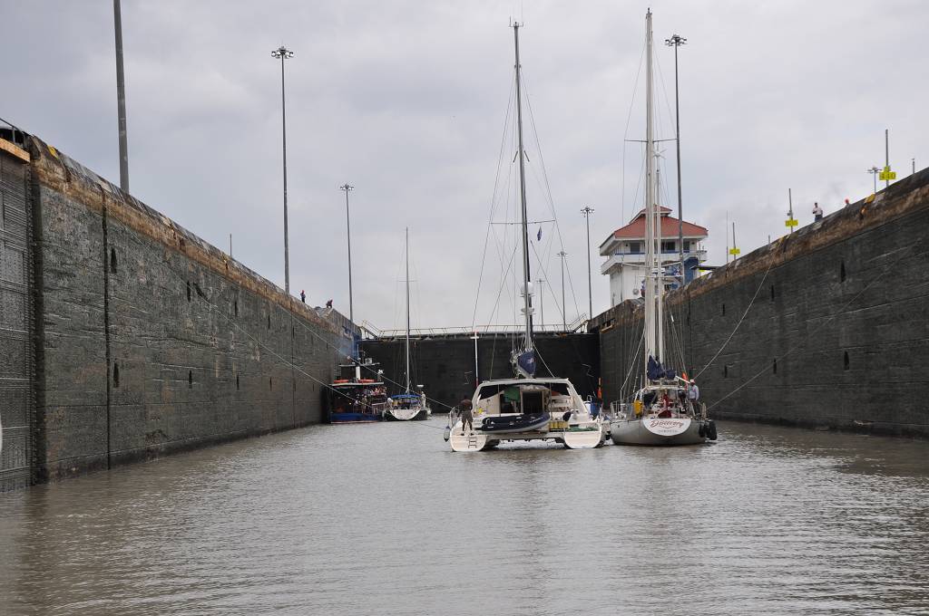 Und tatsächlich, als wir bei der Pedro Miguel Schleuse eintreffen, warten alle anderen 5 Schiffe auf uns, sie waren viel zu früh hier. Wir werden gleich wie gestern als Paket verschnürt. Der Katamaran Promise (USA) ist in der Mitte, das Mono-Segelschiff „Hobo“ (Kanada) ist auf der rechten Seite davon und wir links. Alle drei Schleusen passieren wir total problemlos. Auf dem Katamaran hinter uns gibt es in der ersten Miraflores Schleuse, da wo die Webcam ist, einen Unfall. Ein Mann wird mit blutiger Hand an Land gesetzt und von einer Ambulanz abgeholt. Was genau passiert ist, wissen wir nicht.