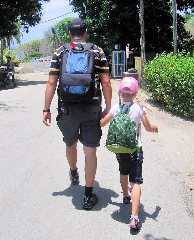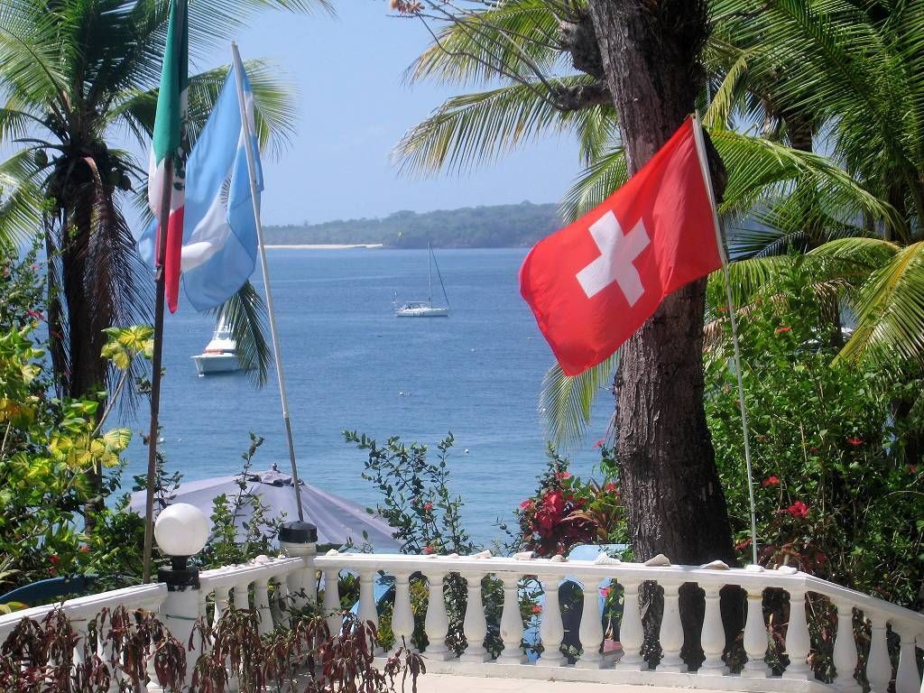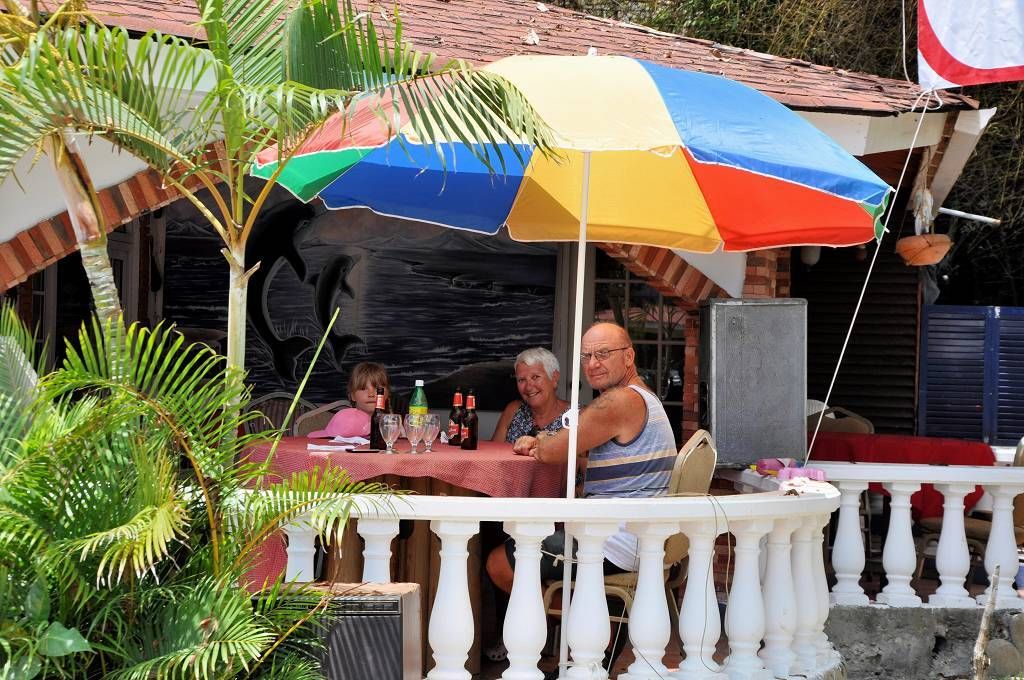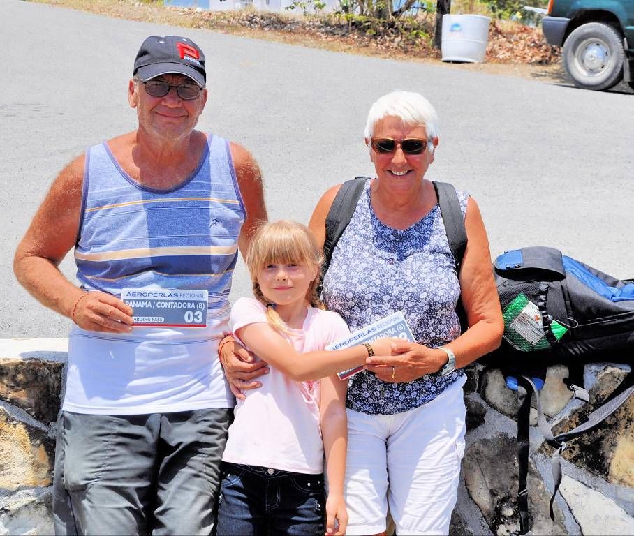 Marcus und Jessi fliegen heute um 11h20 mit einem kleinen Flugzeug von Contadora nach Panama City. Gegen 9h45 sind alle Rucksäcke gepackt und wir steigen alle ins Dinghy. Es hat ziemliche Brandung und um ein Haar fällt Jessi beim Anlanden am Strand mitsamt ihrem Rucksäcklein ins Wasser. Aber wir kommen doch noch alle trocken an Land. Beim Hotel Romantico waschen Jessi und Marcus mit Süsswasser den letzten Pazifiksand von den Füssen und zwängen ihre Füsse nach 14 Tagen wieder in die Turnschuhe. Wir laufen über die Insel zum Flugplatz und erfahren dort, dass es heute KEINEN 11h20-Flug gibt, der fällt heute aus. Der nächste Flug sei erst wieder um 15h. Wir sagen am Schalter, dass die beiden ihren Flug nach Europa um 17h hätten (das stimmt zwar nicht, aber es hilft!). Der Mann am Schalter telefoniert und findet schliesslich noch zwei Plätze in der 13h Maschine. Jetzt ist es 11h und um 12h30 sollen wir wieder am Flugplatz sein. Das Gepäck dürfen wir dort lassen. In einem nahen Restaurant essen wir ein viel zu teures, dafür nicht besonders gutes Mittagessen, auf das wir sehr lange, fast 1 Stunde, warten müssen. Jessi vertreibt sich die Zeit, indem sie die Umgebung und ihre Grosseltern fotografiert.