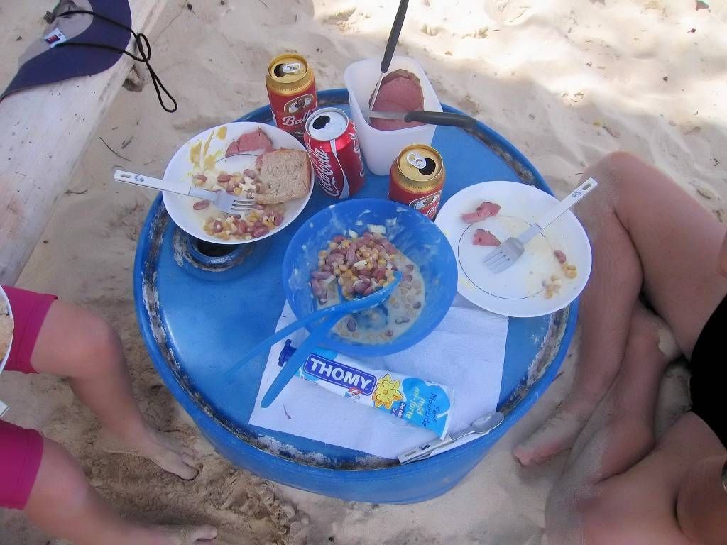 Den Nachmittag verbringen wir wieder am Strand mit Pick-Nicken, Spielen und Baden. Marcus unternimmt mit Jessi eine grosse Schnorcheltour. Sie ist unermüdlich, ständig mit dem Kopf unter Wasser und bemüht sich schön zu schwimmen. Heute sehen wir zwei oder drei grosse Rochen und wieder die Kleinen, die wir schon öfter gesehen haben. Auch der neugierige Kugelfisch sucht immer wieder unsere Nähe.