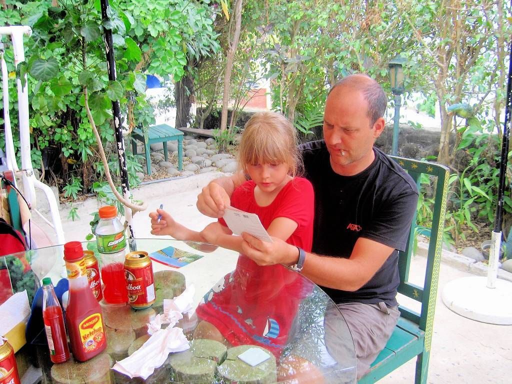 Nun müssen wir aber zurück zum Schiff. Marcus und Jessi müssen noch Kofferpacken und Tage-und Gästebuch schreiben und malen. Danach werden noch weltmeisterlich ein paar Runden UNO gespielt.