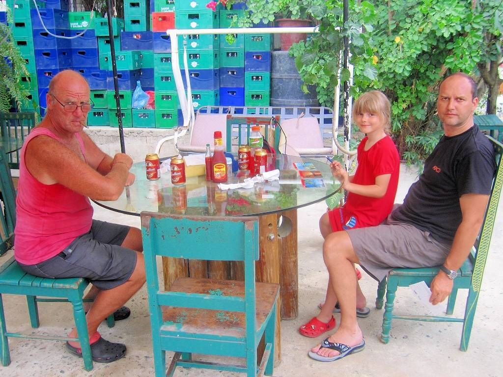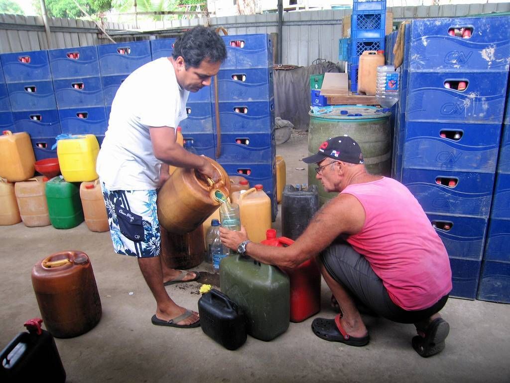 Danach holen wir 18 Gallonen (ca. 65 Liter) Diesel und Benzin in 4 Kanistern. Eigentlich wäre der Laden jetzt geschlossen wegen der Mittagspause, aber er wird extra wegen uns geöffnet. Wir kaufen noch Eier und einen Topf Glacé. Im Restaurant, das zum Laden gehört mampfen die drei Glacéschlecker gemeinsam ihren Glacétopf leer und ich bekomme ein Käffeli. Horacio, den Einheimischen, der im Restaurant sitzt und schon eine ganze Batterie leere Bierfläschchen vor sich stehen hat, fragen wir, ob er uns und die vier Kanister mit seinem Golfauto zum Strand führen könne. Das macht er sehr gerne für 3 US$. Mit einem Mordszacken (so kommt es mir wenigstens vor) fahren wir zum Strand. Paul und Marcus bringen das Dinghy und den Diesel durch das auflaufende Wasser zur MABUHAY und Jessi und ich warten am Strand auf sie. Die beiden bringen