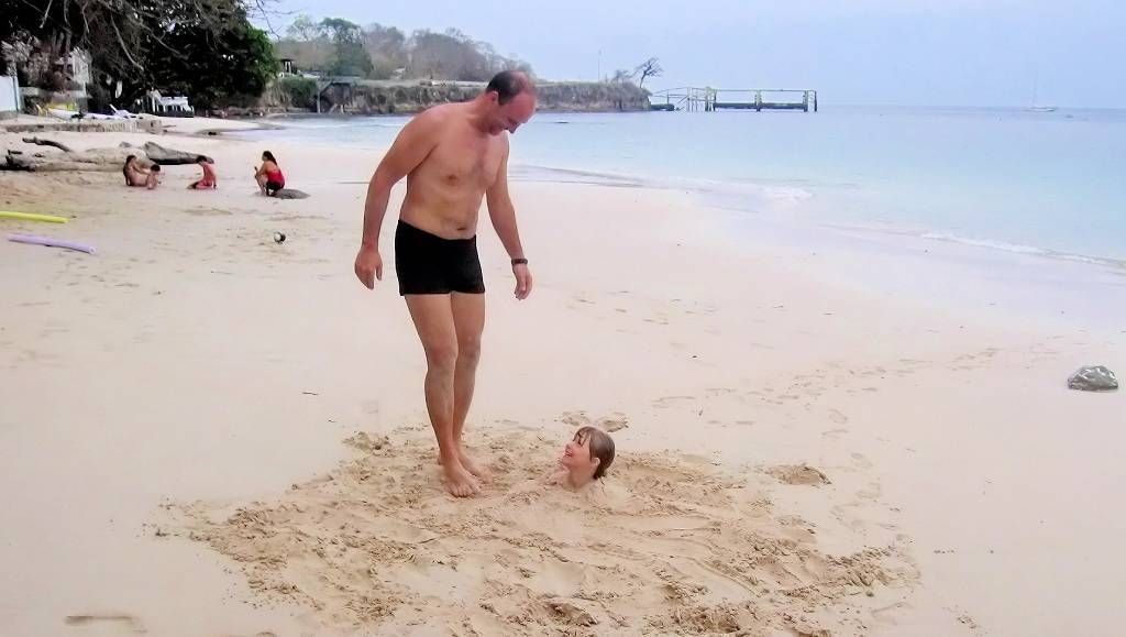 die Badesachen mit und wir bleiben bis gegen 17h am Strand. Marcus verbuddelt Jessi bis zum Hals im Sand.