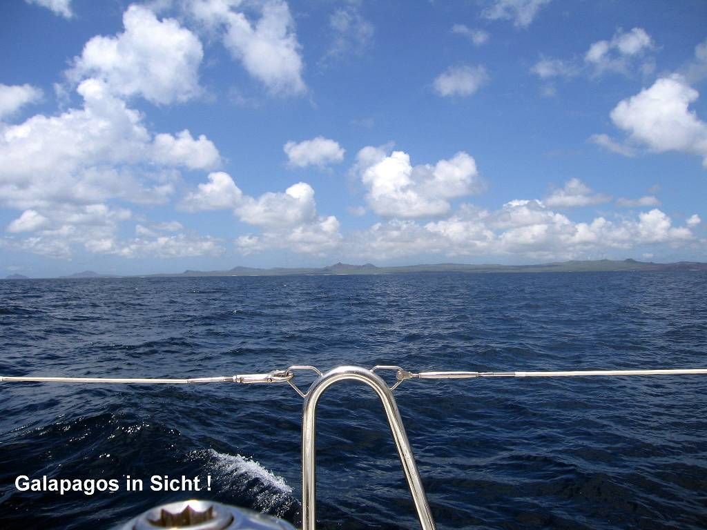 Wir verbringen eine sehr ruhige Nacht unter Segeln. Die MABUHAY läuft unverdrossen ihren Weg. Der Wind ist jetzt schön konstant mit ca. 12 Knoten aus SE. Wir sehen kein einziges Schiff. Am Morgen, bei wunderbarstem Sonnenschein sehen wir die Berge der Galapagos-Inseln. Schön!!!