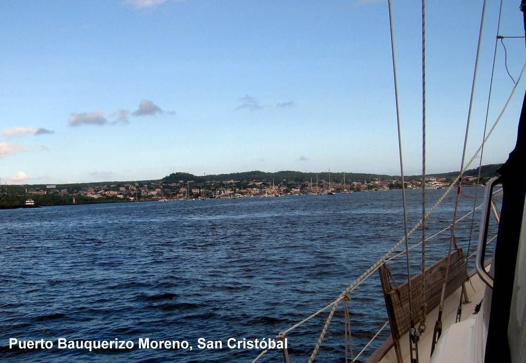 Um 8h haben wir noch 42sm bis zur Insel San Cristóbal, wo wir hin wollen. Und jetzt haben wir endlich einmal die Strömung MIT uns und nicht GEGEN uns. Heute finden wir viele tote kleine Tintenfische an Bord. Die Insel San Cristóbal zieht sich enorm in die Länge. Wir fahren an der Westseite entlang. Gegen 17h ankern wir in der Wreck Bay, vor der Ortschaft Puerto Baquerizo Moreno. Wir werden sofort vom Geschrei der vielen Seelöwen begrüsst. Und danach werden wir vom Agenten Bolivar, noch nicht geankert, vom Wassertaxi aus, unter Beschlag genommen. Wir hatten ihn per Mail über den Trans-Ocean-Stützpunkt angefordert. Ohne Agenten geht hier auf den Galapagos gar nichts. Er sagt uns, dass er morgen um 9h komme, um das Einklarieren für uns zu erledigen.