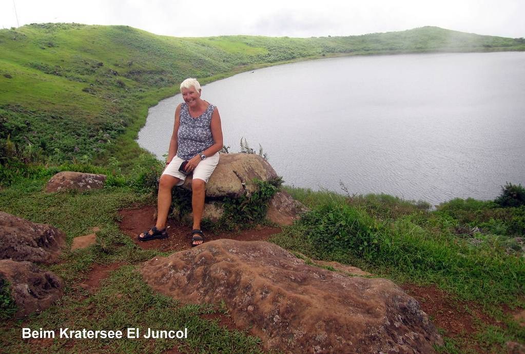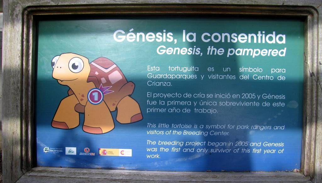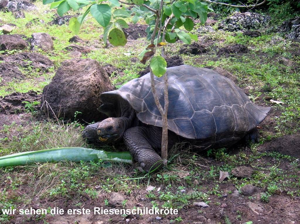 Wir spazieren zum Kratersee „Laguna el Junco“, einem kreisrunden Süsswassersee, der vom Regen und Nebelniederschlag gespiesen wird. Leider scheint im Moment die Sonne nicht und so ist der See nicht so schön blau wie auf dem Prospekt von der Insel. Übrigens hat es auf San Cristóbal keine aktiven Vulkane mehr. Von hier geht es weiter zur Landschildkröten-Aufzuchtstation. Auch hier erklärt uns George alles was wir wissen wollen. Es ist sehr interessant. Die berühmteste Schildkröte hier ist die 5-jährige Genesis. Sie ist die erste Schildkröte die hier in diesem Projekt geboren wurde. Diese Sorte Schildkröten wird ca.130 kg schwer und 160 Jahre alt. Die Jüngsten die wir sehen, sind 3 Monate alt. Am liebsten würden wir so ein herziges kleines Ding mitnehmen. Zur Zeit befinden sich fünf Eier im Brutkasten. Das Geschlecht der Schildkröten kann manipuliert werden, je nach Temperatur mit der die Eier ausgebrütet werden, gibt es Mädchen etwa 26°, oder Buben 29° (oder war es umgekehrt?). Wir schauen den grossen Brocken zu, wie sie genüsslich am Grünzeug fressen, das sie dreimal pro Woche von den Park- Rangern bekommen. Die restlichen 4 Tage müssen sie ihr Futter selber suchen.