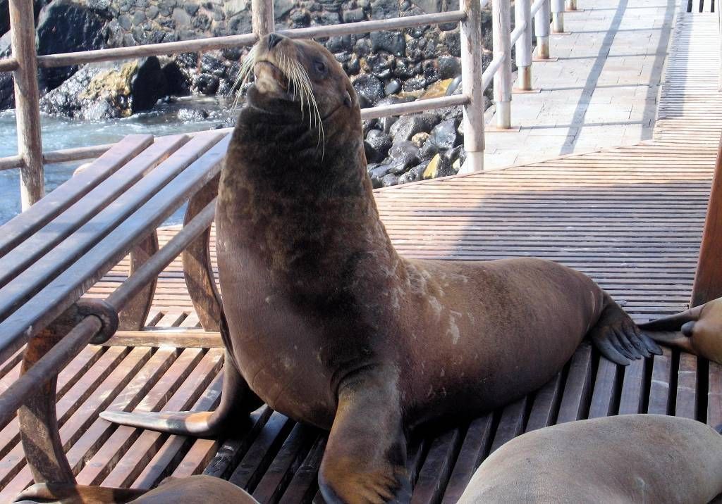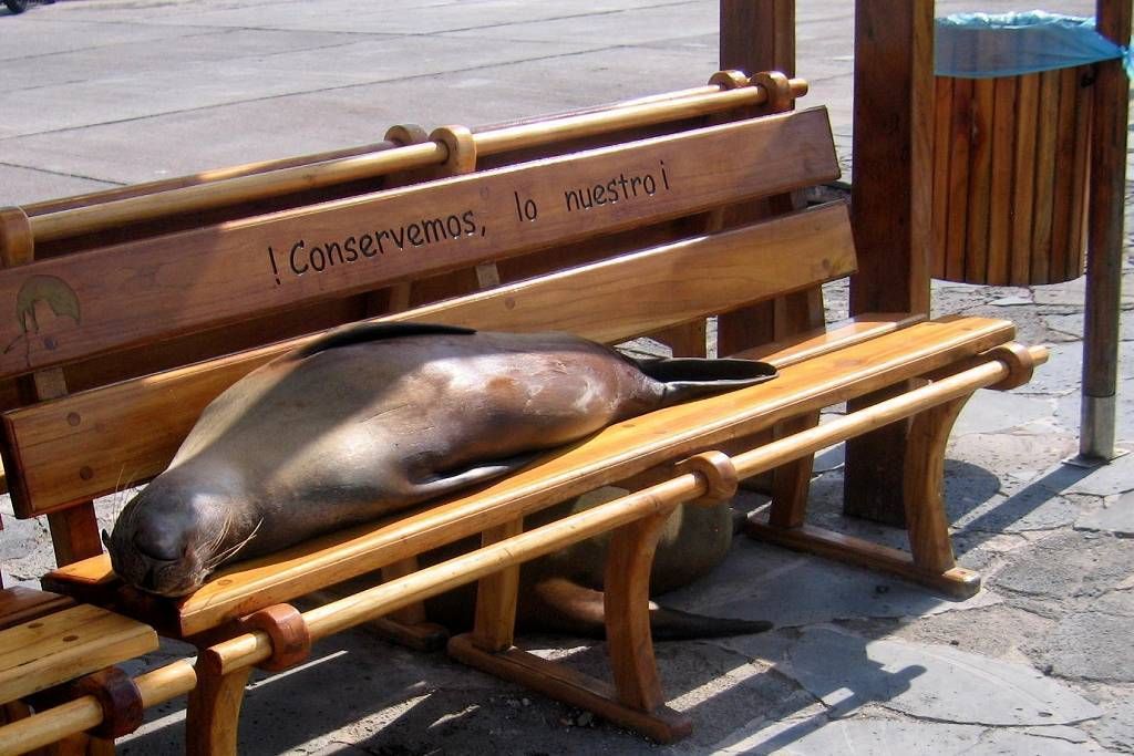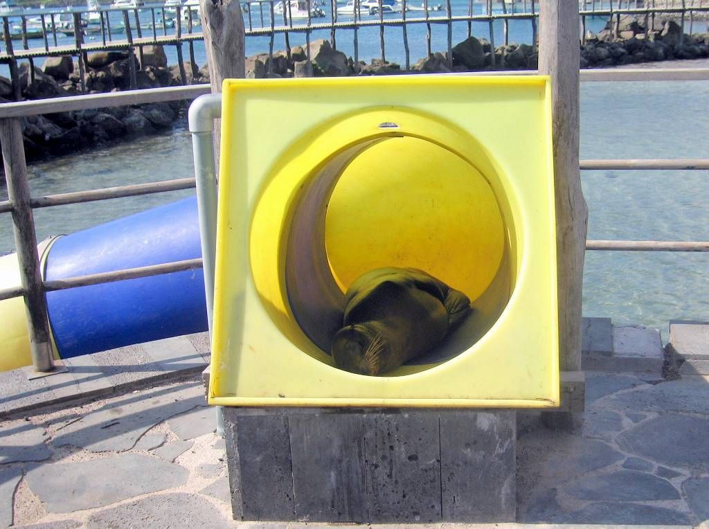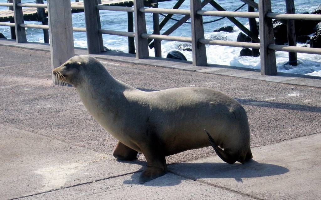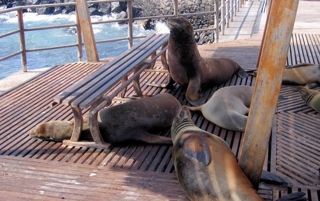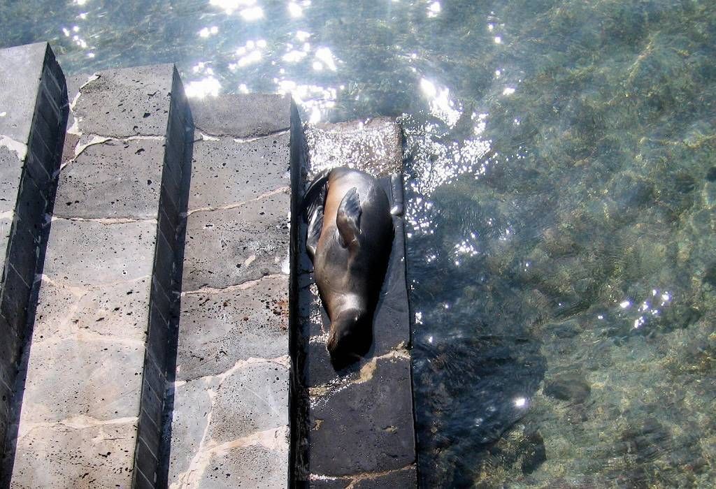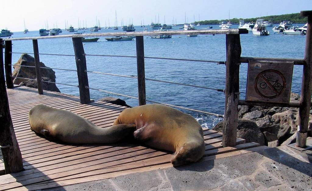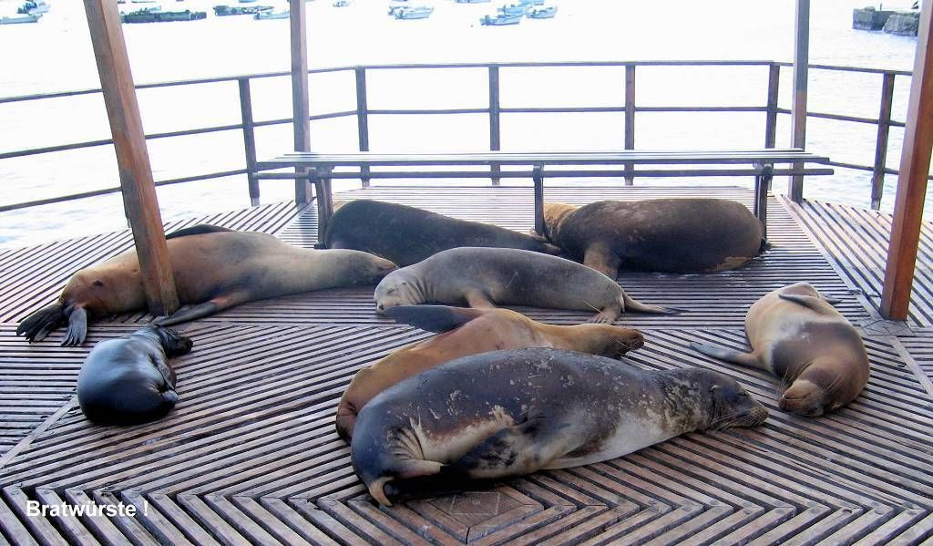 Wir ankern hinter der ANDORI von den Schweizern Doris und Andi. Die beiden kommen sofort mit einem Six-Pack Bier zu uns an Bord. Anschliessend an den Begrüssungstrunk gehen wir alle vier per Wassertaxi an Land. Das wäre eigentlich offiziell VOR dem Einklarieren verboten, aber Bolivar hat uns gesagt: No problema! Beim Landesteg des Wassertaxis staunen wir nur noch. ÜBERALL liegen dicke Seelöwen herum. Auf den Steintreppen, auf und unter den Parkbänken, auf den Trottoirs, auf den Felsen, auf dem Kinderspielplatz, einfach ÜBERALL! Kleine Seelöwen saugen schmatzend an ihren Müttern herum. Für uns ein überraschendes und ungewohntes Bild.