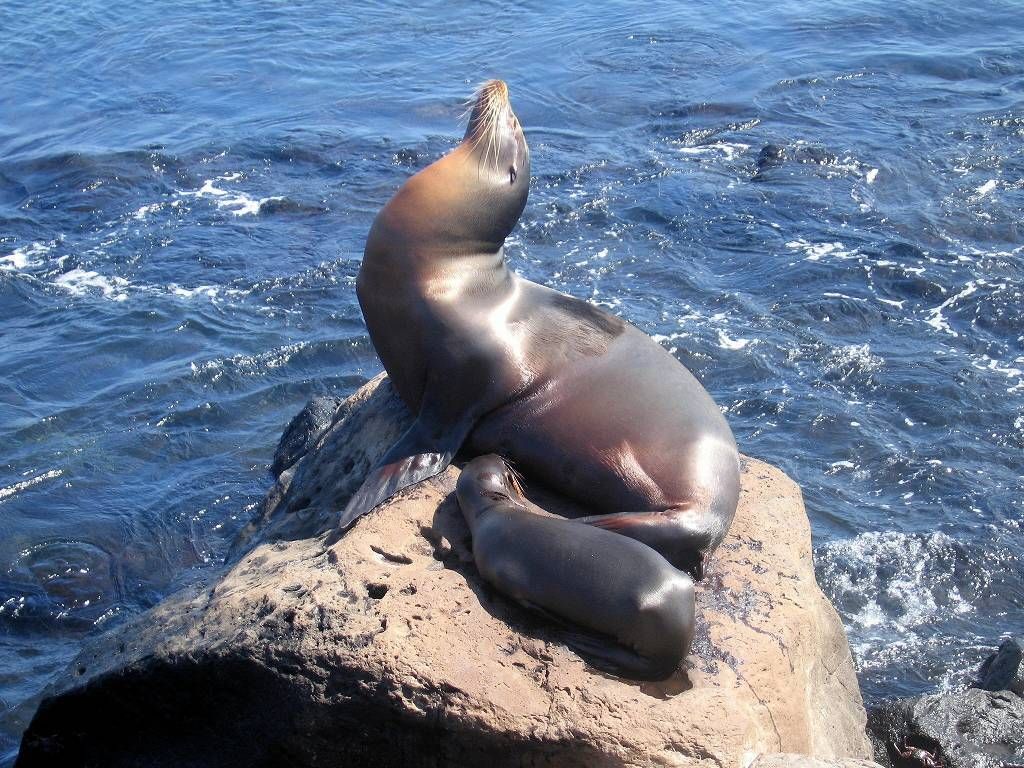 Gegen morgen , um 04h oder 05h hören wir einen Seelöwen draussen neben der MABUHAY husten. Die Seelöwen benutzen jede Möglichkeit, auf die Segelschiffe oder Motorboote zu klettern und sich dort gemütlich niederzulassen. Bei uns ist das nicht möglich, weil wir unsere Badeplattform hochziehen können und die Viecher so nicht hinaufklettern können, es ist zu hoch. Aber alle Schiffe, die hinten offen sind oder sogar eine Treppe haben, wie z.B. die Katamarane, bekommen unweigerlich ungebetenen Besuch. Die Seelöwen sind ja schon hübsch und lustig, besonders die Kleinen, aber trotzdem können sie auch lästig sein, wenn sie das Boot vollsch...sen.