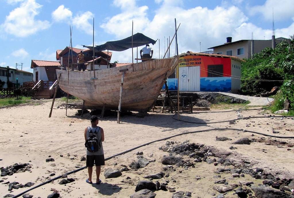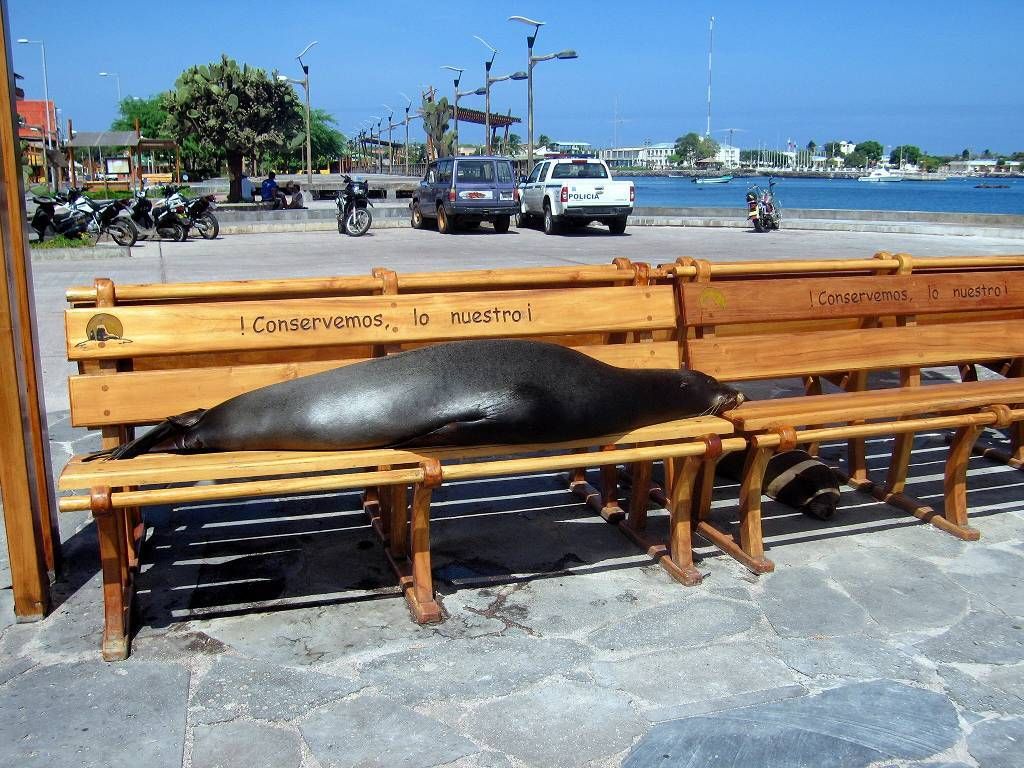 Nun laufen wir zum Galapagos- Informations-Zentrum, wo sehr viel Interessantes über die Inseln zu erfahren ist. Wir laufen weiter bis zu einem schönen Sandstrand bei der Punta Carola, wo wir vom Leuchtturm aus die Aussicht geniessen. Es hat hier Blaufusstölpel, haufenweise Seelöwen und schwarze Meeresechsen. Zurück im Dorf essen wir im Restaurant „Casa Blanca“ ein Thun-Sandwich. Dieses besteht aus zwei Scheiben Toastbrot (ungetoastet), eine Scheibe davon mit Senf bestrichen, Salatblättern, eine oder zweiTomatenscheiben und ein paar Brösmeli trockenen Thon. Ich frage die Wirtin: “Und das soll 3$ kosten?“ Sie meint:“ o.k. sie gebe uns das Sandwich für 2$, es habe drum keinen Thon mehr!“ Paul will mir noch einen Kaffee spendieren und so gehen wir in den ersten Stock eines Gebäudes und ich trinke einen sehr guten, grossen Espresso, dazu esse ich einen zünftigen Fruchtsalat mit vielen frischen Früchten und Yoghurt, und Paul nimmt ein grosses Glas frisch gemixten Melonensaft, alles für 5$. Zufrieden gehen wir zurück auf die MABUHAY, wo wir es uns gemütlich machen.