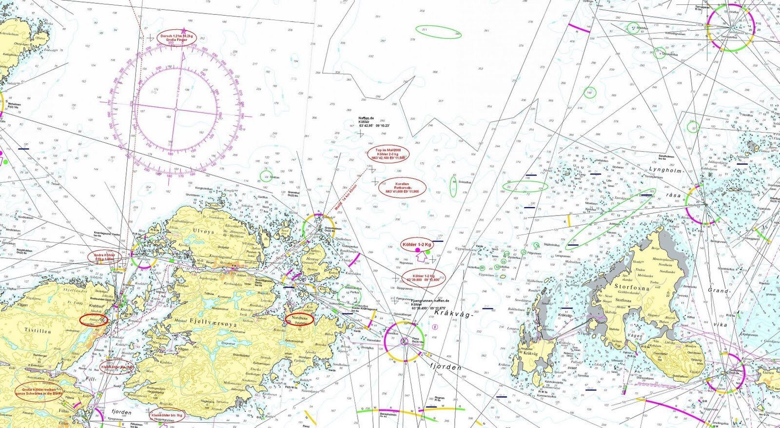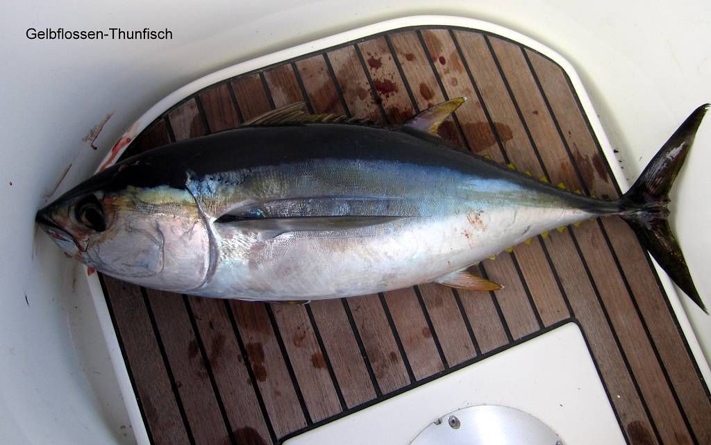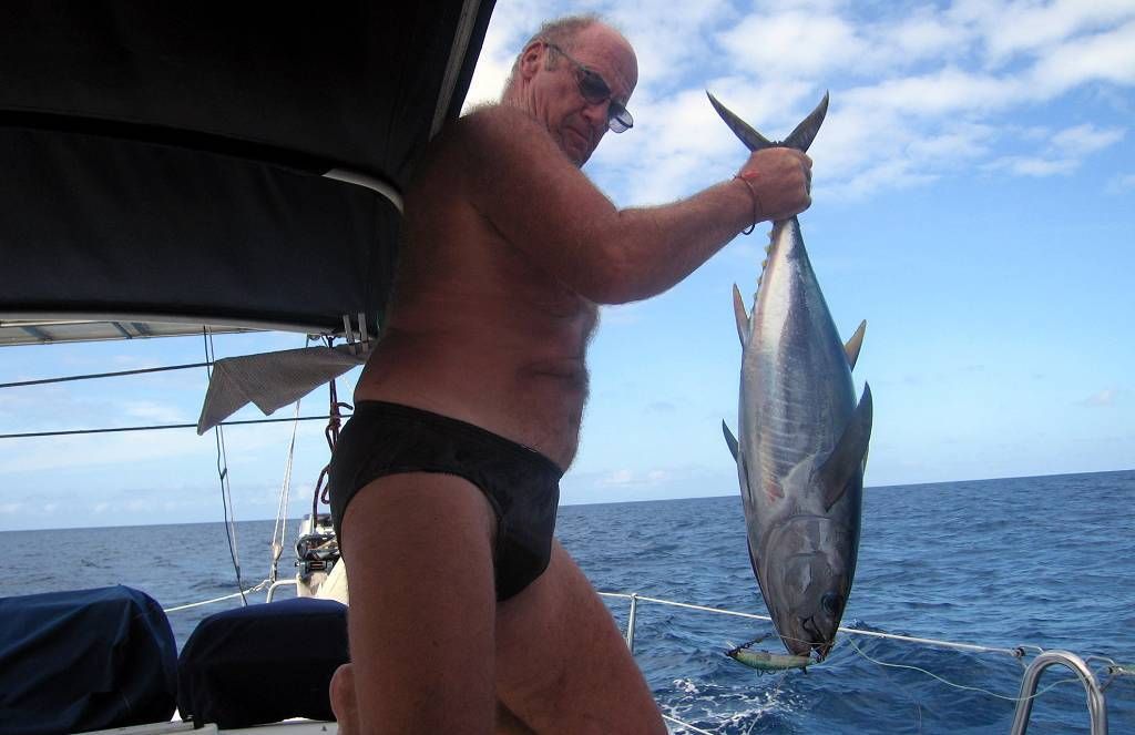Aber jetzt sind wir also unterwegs zu neuen Abenteuern. Es läuft gut. Um 14h23 werden wir brutal vom Lesen (ich) und Dösen (Paul) aufgeschreckt. Hilfe, wir haben einen Fisch am Angelhaken! Wir befinden uns am Rande einer etwa 50m tiefen „Untiefe“. Ich hatte Paul für diese Stelle einen grossen Fisch vorausgesagt. Und es ist ein Grosser, ein 80cm langer und bestimmt 10 kg schwerer Gelbflossen-Thunfisch. Nein, so gross hätte er nicht sein müssen. Er ist für zwei Personen viel zu gross. Nach der blutigen Schlachterei haben wir über 4.5 kg wunderbares Fischfleisch im Kühlfach.