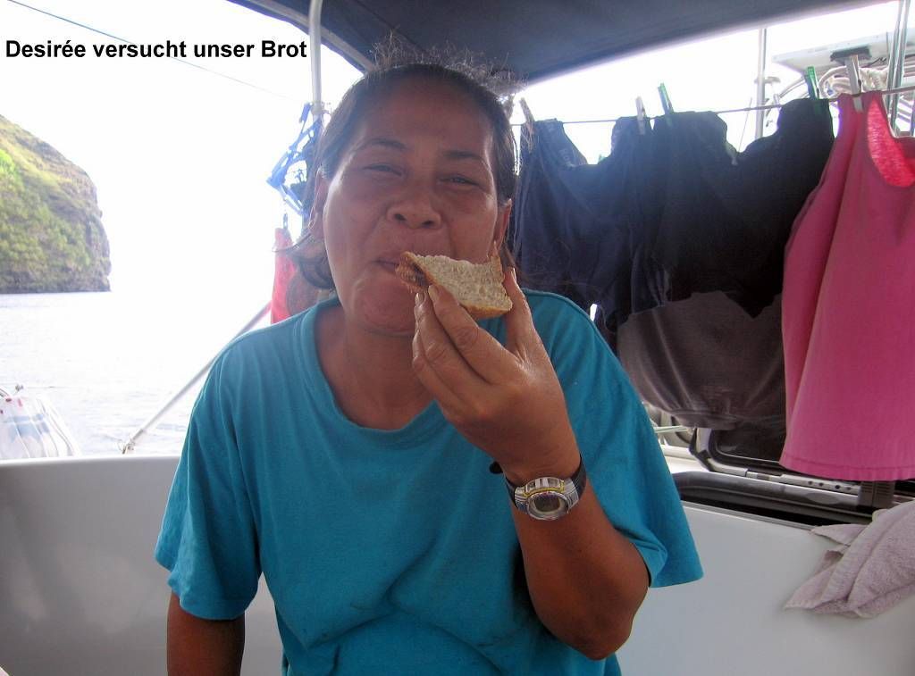 Paul wechselt mit meiner Assistenz die beiden Leinen des Vorsegels aus, die ziemlich mitgenommen aussehen. Ich darf dafür wieder einmal Brot kneten. Der Schweizer Jean-Pierre kommt um uns zu begrüssen und um uns zu fragen, ob wir am Sonntag am Erdofenessen teilnehmen würden. Ja, wir wollen! Am Nachmittag kommt er nochmals, diesmal mit der Polynesierin Desirée.