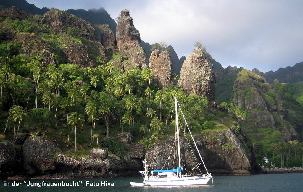 Um 9h heben die AROHA und wir die Anker und fahren unter Motor 3 sm weiter bis zum Ort Hanavave. Hier in der „Bay of Virgins“, „der Jungfrauenbucht“, ankern wir und hoffen, dass es hier weniger schaukelt. Die ELAN (Dörthe und Frank), die DOUBLE MOON (Walter) und die ALYA (der Schweizer Jean-Pierre), dazu ein englisches Schiff, das aussieht wie ein Piratenschiff, sind schon hier. Die Bucht ist ziemlich spektakulär, mit den mächtigen Felsformationen, die sie umgeben. Die „ELAN“ begrüsst uns mit dem Muschelhorn!