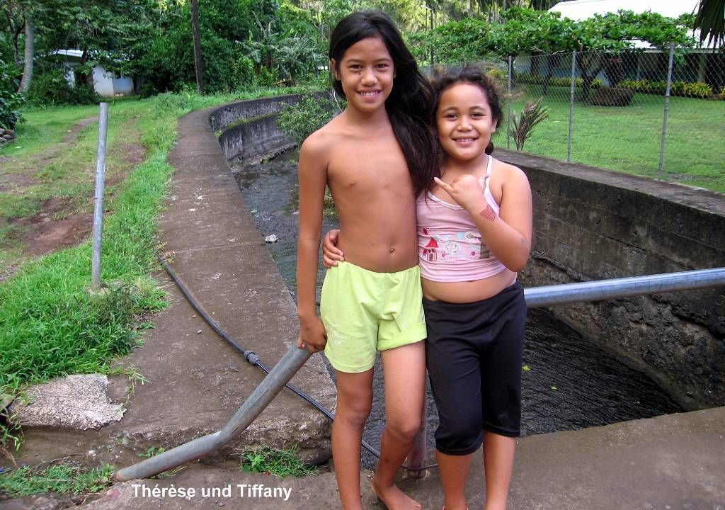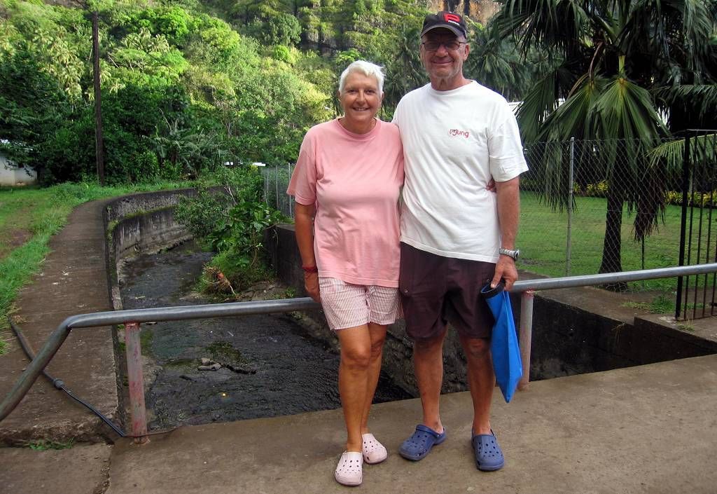 Paul repariert den ganzen Morgen unseren Salontisch, der auseinanderfällt. Der Wind ist immer noch beachtlich und die Wäsche die ich heute aufhänge ist, obwohl es zwischendurch immer wieder regnet, im Nu trocken. Endlich, am Nachmittag beruhigt sich die Wettersituation und gegen 16h gehen Paul und ich erstmals auf den Marquesas an Land. Wir schauen uns das Dörfchen Hanavave (ca. 300 Einwohner) an und spazieren bis ans Ende des Dorfes. Das Dorf ist picobello sauber, kein bisschen Müll, der herumliegt. Richtig schön. Überall grünt und blüht es. Die Kinder begrüssen uns alle freundlich auf Französisch und wollen wissen wie alt wir sind und wie wir heissen. Die Felsen rundherum sind einmalig spektakulär.