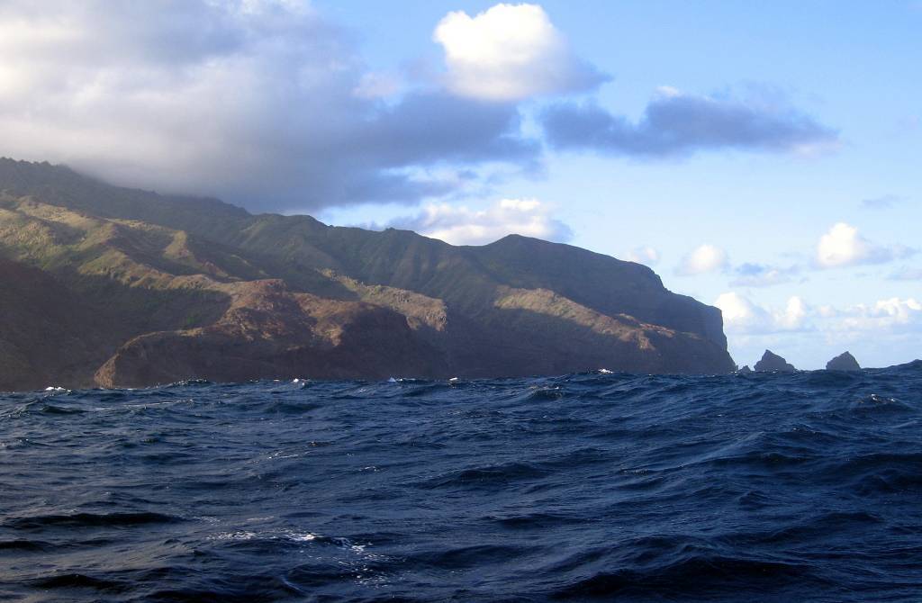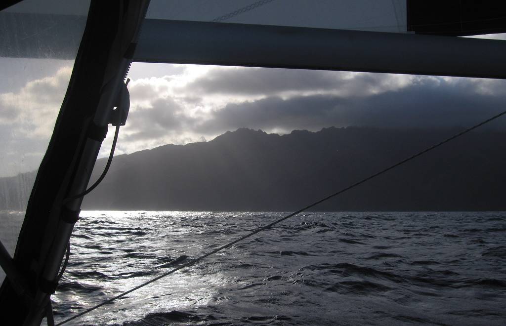 Um 8h30 sichten wir erstmals die AROHA, knapp vor uns, die lange Zeit parallel zu uns gesegelt ist. Wir sprechen über Funk, Kanal 69 mit ihnen und erfahren, dass sie auch seit heute morgen 04h motoren. Um 12h40, wir haben noch 30 Meilen, sehen wir die Umrisse der Insel Fatu Hiva. Je näher wir kommen, desto düsterer sieht die Insel aus, total wolkenverhangen. Um 18h, es ist noch hell, ankern wir vor der Ortschaft Omoa, bei der Insel Fatu Hiva.