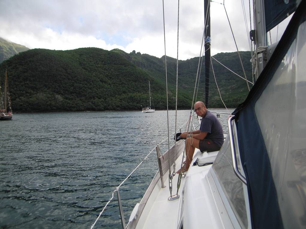 Um 9h15 helfen uns Andi, Eric und Holger mit ihren Dinghys, den Heckanker zu heben. Es geht nicht! Also heben wir zuerst unseren Buganker mit der Ankerwinsch hoch. Dann fahren wir mit dem Bug dorthin, wo unser Heckanker liegt und Paul kann den Anker dann von Hand über die Ankerrrolle hochziehen. Puhh, das ganze Manöver dauert ca.30 Minuten, zwischen den anderen Schiffen. Endlich sind wir frei und fahren Richtung Insel Tahuata. Das sind nur 10 sm, aber es pfeift mit 20 Knoten Wind und hat etwa 3-4 m hohe Wellen. Nur mit dem halben Vorsegel erreichen wir kurz vor 12 h die Ankerbucht Hanamoenoa auf der Insel Tahuata. Als erstes sehen wir einen grossen Rochen an der MABUHAY vorbeischweben. Das Wasser ist wunderschön blau und klar. Es sind schon 12 Segelschiffe hier! Nach dem kalten Mittagessen taucht Paul zu unserem Anker um zu sehen, ob er gut hält. Dabei sieht er, dass unsere Anode am Propeller wegkorrodiert ist. Wir hatten sie in Panama, am 10.März 2011 neu montiert. Er schnappt sich die Taucherausrüstung und schraubt sofort eine neue Anode an. Nach der Tauchaktion will Paul die Tauchflasche füllen. Dabei explodiert der Druckmanometer am Tauchkompressor und die Flasche kann nicht fertig gefüllt werden.