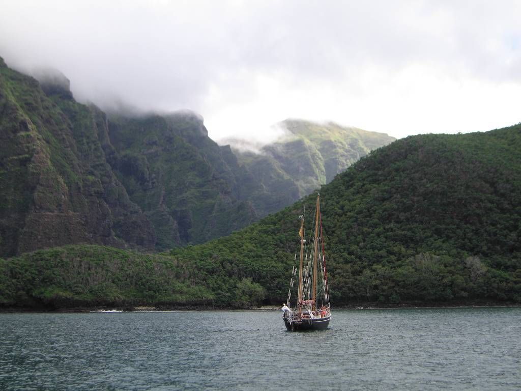 Von 24h bis 03h habe ich Dienst und bin hellwach! Dafür bin ich dann am Morgen umso „kaoer“. Um 10h ankern wir in der sehr, sehr schönen, rundum von hohen Bergen eingeschlossenen Bucht Hakatea, auf der Insel Nuku Hiva. Meine vielen Mückenstiche von Hanamenu jucken und plagen mich ganz fürchterlich! Während unserem sehr späten Frühstück (fast um 10h30), sieht Paul einen riesigen Rochen aus dem Wasser in die Luft springen. Ich sehe ihn leider nicht, weil ich mit dem Rücken zum Rochen sitze. Aber dafür sehen wir beide einige Schildkröten. Es sind jetzt mit uns 8 Segler da, unter anderem die „Sanuk“, das österreichische Schwesterschiff der MABUHAY. Wieso sagt man eigentlich nicht „Bruderschiff“???