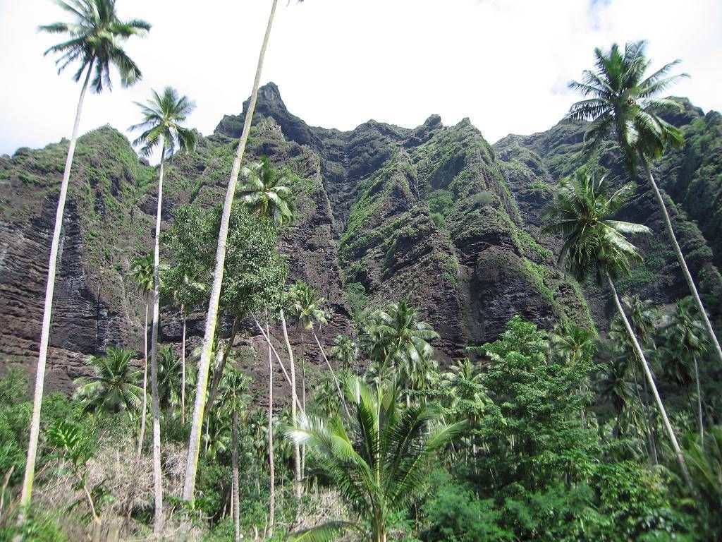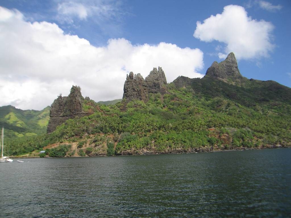 Nach dem Brotteigkneten, kurz nach 10h geht es los. Wir können die 12 sm prima segeln und erreichen um 12h45 die Bucht Hanamenu auf Hiva Oa. Die Bucht ist auf drei Seiten von hohen Felswänden umschlossen und heftige Fallböen sausen auf uns herab. Gegen 15h (nach dem Brotbacken), fahren wir per Dinghy ans Ende der Bucht. Es hat einen schwarzen Sandstrand und einen kleinen Fluss, der total braunes Wasser in die Bucht schwemmt. Beim Anlanden am Strand haben wir Pech. Eine besonders grosse Welle haut uns quer und schwappt ins Dinghy. Sofort sind wir beide bis zum Bauchnabel pflotschnass. Zum Glück ist der Fotoapparat im wasserdichten Sack verstaut. Mit tropfnassen Shorts spazieren wir durch das „Dorf“ Hanamenu, das etwa aus sechs Häusern besteht. Wir schlendern durch den Palmenwald, bis zum Fluss, wo es nicht mehr weiter geht. Nach ca. einer Stunde flüchten wir wieder auf die MABUHAY. An Land wollen uns die „Nono's“ (winzige Mücken) auffressen, d.h, natürlich besonders mich.