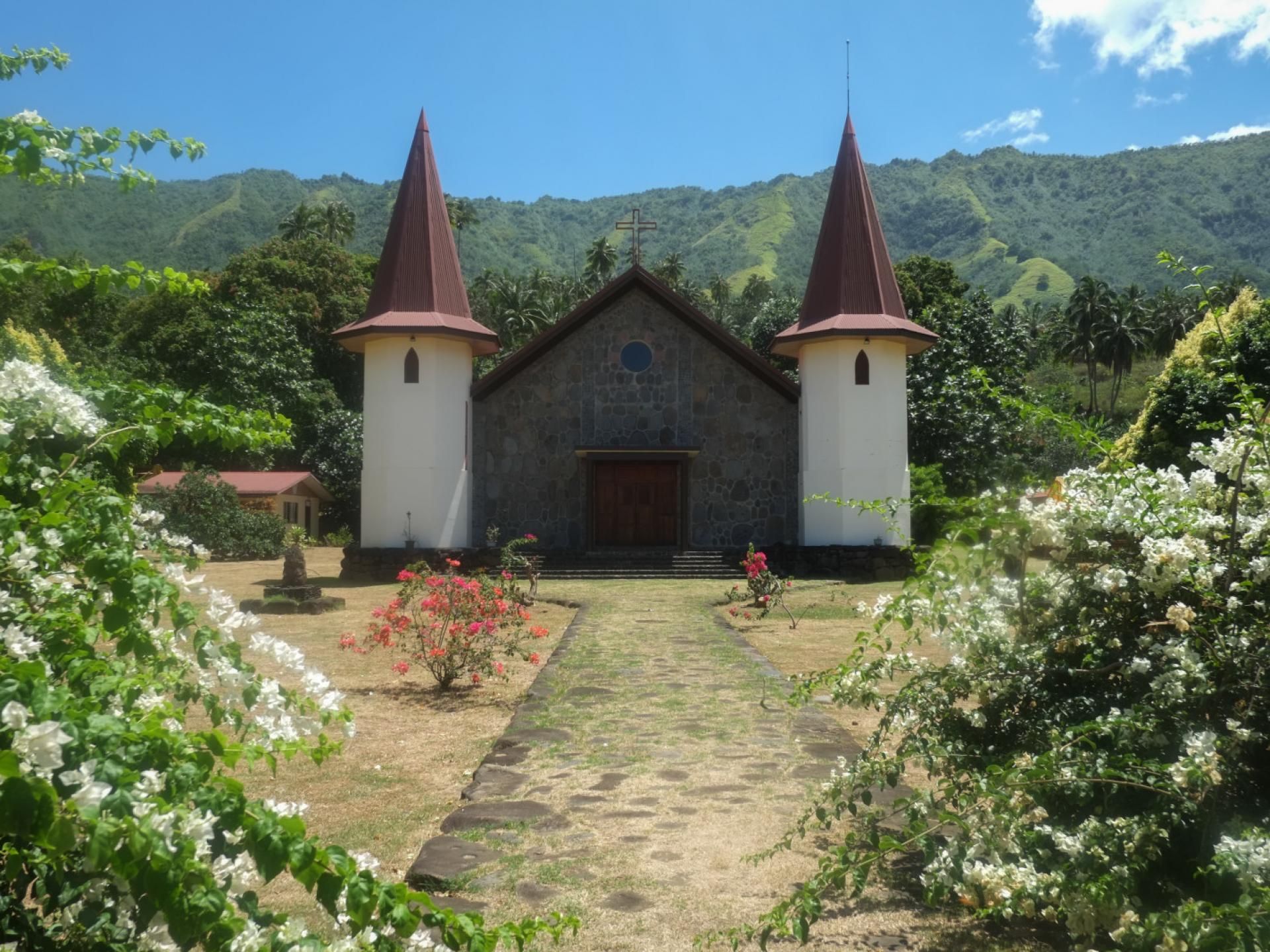 Um 7h30 sind wir zu sechst in der wunderschönen Kirche von Hatiheu und vertreten hier Deutschland, Österreich und die Schweiz. Gestern sagte man uns im Dorf, die Messe beginne um 7h30, aber in Wirklichkeit geht es erst um 8h00 los. Ich achte darauf, dass Paul und Bertel NICHT nebeneinander sitzen. Die würden sich nämlich gegenseitig Witze erzählen oder über Schiffsprobleme fachsimpeln!!!