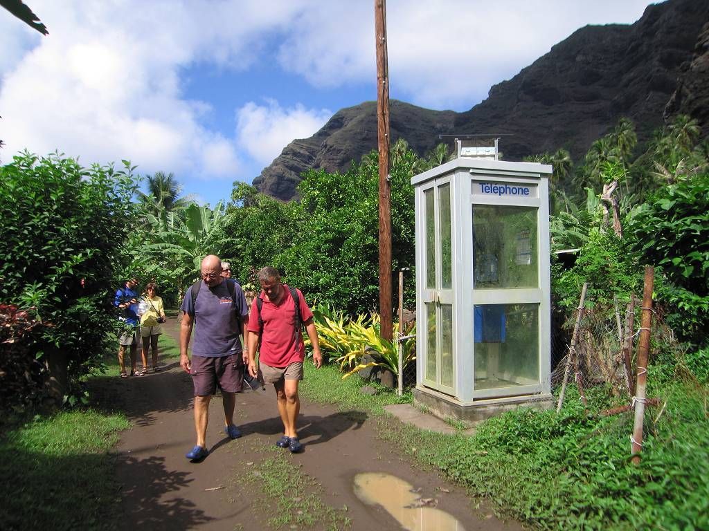 Schon bald müssen wir den Fluss, der vom Wasserfall kommt, zum ersten Mal durchqueren. Aber selbstverständlich OHNE eine Brücke!!! Bis zu den Knien waten wir durch das Wasser, immer darauf wartend, in den Fluss zu fallen. Nach dem wir alle wieder auf dem Trockenen stehen, gelangen wir in das winzige Dorf Hakaui. Hier bestaunen wir als erstes die schöne, scheinbar noch intakte Telefonzelle, die mit Solarpaneelen betrieben wird. Und das mitten im Regenwald. Dann bewundern wir die wunderschönen, sauberen und blühenden Gärten der Bewohner.