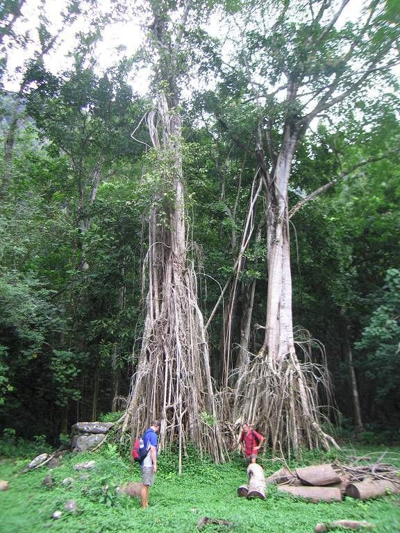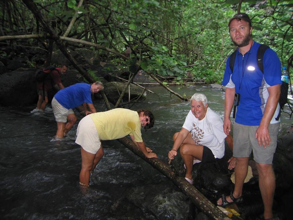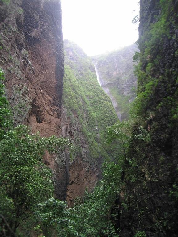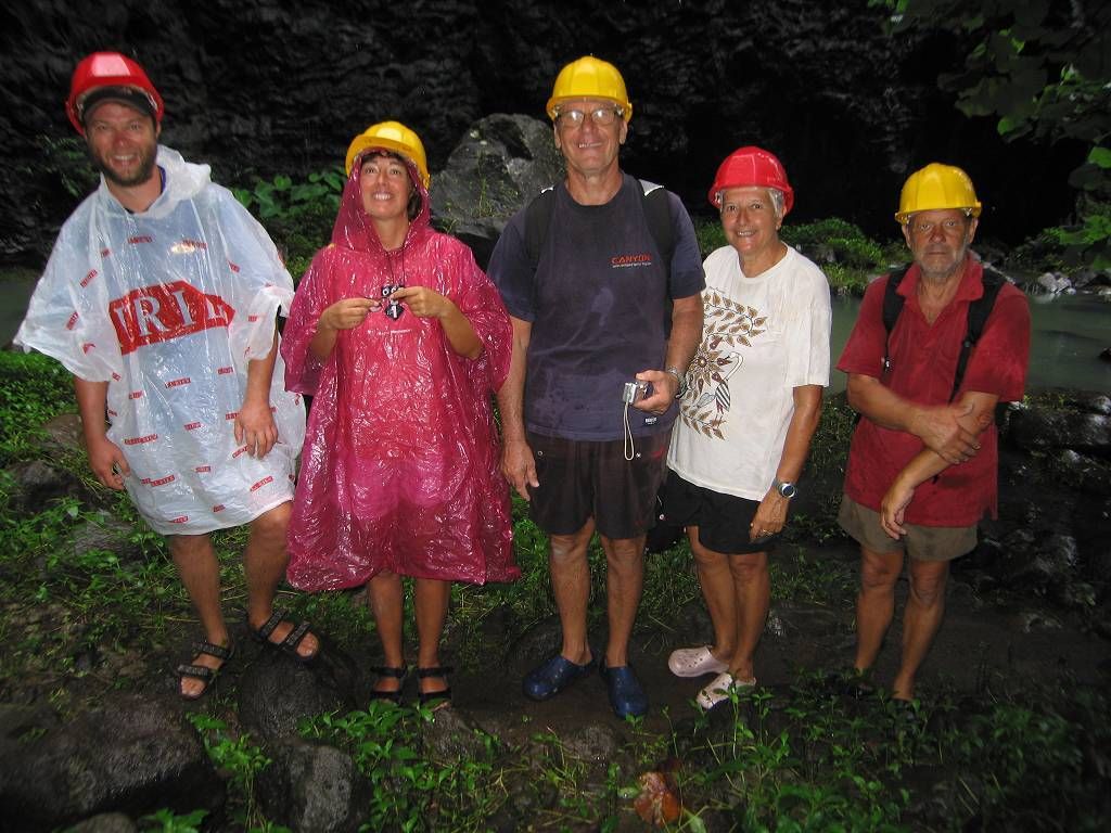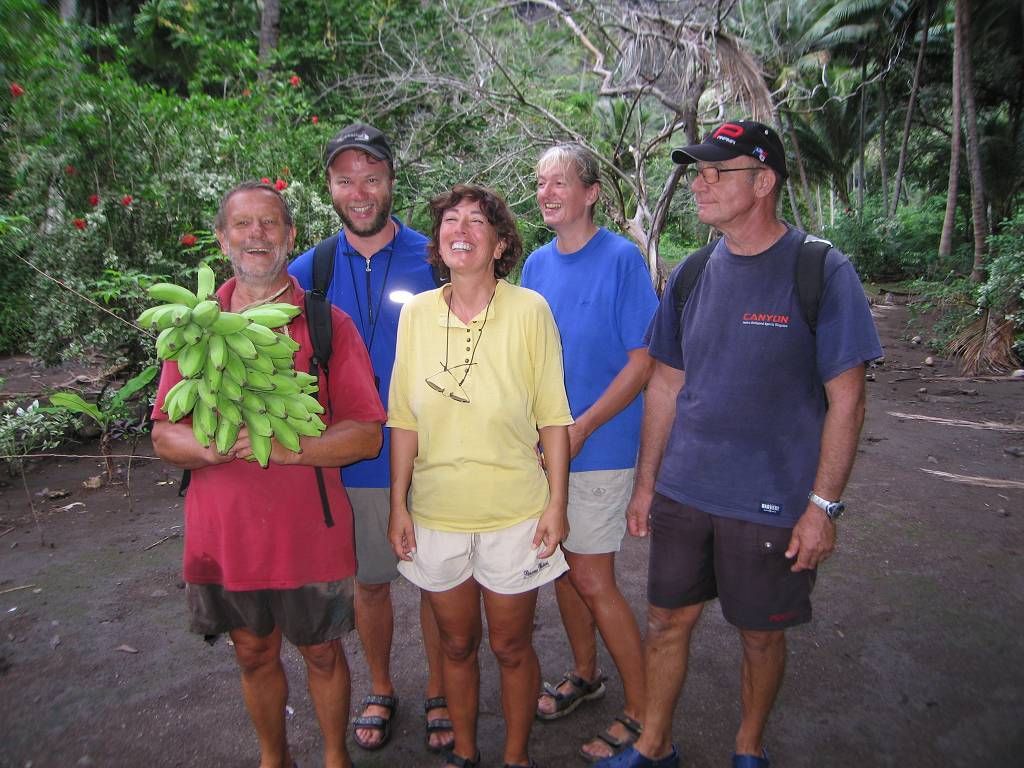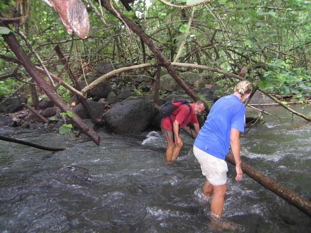 Nach dem Dorf wird der Weg immer schmaler und immer glitschiger. Holger macht eine ungewollte Landung in den Schlamm, später auch Paul. Im ganzen müssen wir den Fluss fünf Mal queren, einmal liegt ein Baumstamm darüber, so dass wir uns daran festhalten können. Wir sehen alle sehr bald aus wie die Schweinchen und sobald wir stehen bleiben, zerstechen uns die Mücken unbarmherzig. Und das machen wir alles freiwillig! Aber das Tal, das wir durchwandern ist enorm schön. Jedesmal wenn wir den Fluss queren, waschen wir uns wieder ein wenig sauber, um 30 Sekunden später wieder genau gleich dreckig auszusehen. Paul und ich wollten eigentlich unsere schönen Leder-Wanderschuhe anziehen. Aber zum Glück haben wir uns in letzter Minute umbesonnen und uns für die Crocs entschieden. Das war eine gute Wahl. Nach fast 3 Stunden Schlammwandern und Rutschpartien kommen wir endlich zu dem berühmten Wasserfall und sind ein wenig enttäuscht. Der Wasserfall wäre zwar schon beeindruckend, wenn man ihn in ganzer Grösse sehen könnte. Aber man sieht nur den obersten Teil auf der Herwanderung (aus der Ferne), und den untersten Teil (etwa 30m) beim Ziel, weil der grösste Teil des Falles durch einen Kamin geht und nicht einsehbar ist. Es regnet und wir essen unser mitgebrachtes Brot und Wurst im Stehen. Nicht gerade was wir uns vorgestellt hatten. Der Rückweg erweist sich als fast noch schwieriger, weil es inzwischen geregnet hat und der Fluss noch mehr angeschwollen und jetzt reissender ist. Monika und Holger haut es um, aber zum Glück passiert nichts Schlimmeres dabei. Nach 2½ Stunden sind wir alle gesund wieder im Dorf Hakaui und kaufen bei einem Haus grüne Bananen und Ananas ein.