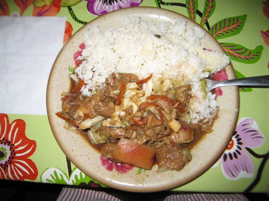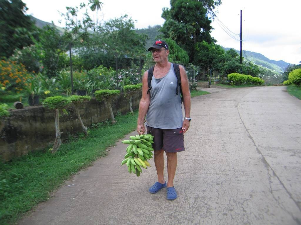 Wir machen sofort das Dinghy klar und fahren ins Örtchen Taipivai. Wir haben keine Ahnung, wo sich die Gemüsegärtnerei befindet. Aber wir fragen uns durch. Zuerst essen wir im „Dorf“ in der Küche einer Kneippe zu Mittag. Es gibt Reis und „cochon“, gekochtes Schwein mit Kohl. Es ist nicht schlecht, aber für meinem Geschmack hat das „cochon“ ein bisschen viel Schwarte und Fett. Dazu gibt es Brot, jedem 1½ Banane und frischgepresstes Zitronenwasser. In der primitiven Küche hat es Tausenden von lästigen Fliegen, die herumschwirren. Aber die beiden Frauen die hier kochen sind sehr nett. Nach dem Essen spazieren wir durch das Dörfchen und fragen an drei Orten, ob sie uns Bananen oder Pampelmusen verkaufen. Beim dritten Ort werden wir fündig und wir kehren schwer beladen mit einem ganzen Strunk grüne Bananen, 8 Pampelmusen, 3 Salatköpfen, 5 kleinen Kabisköpfen, einem Bündel Strumpfbandbohnen (lange grüne Bohnen) und 6 Gurken (Kosten ca.30.-US$) kehren wir zur MABUHAY zurück. Und wir werden ALLES für uns selber behalten!!!