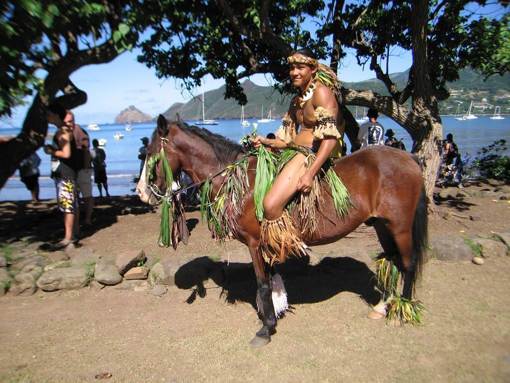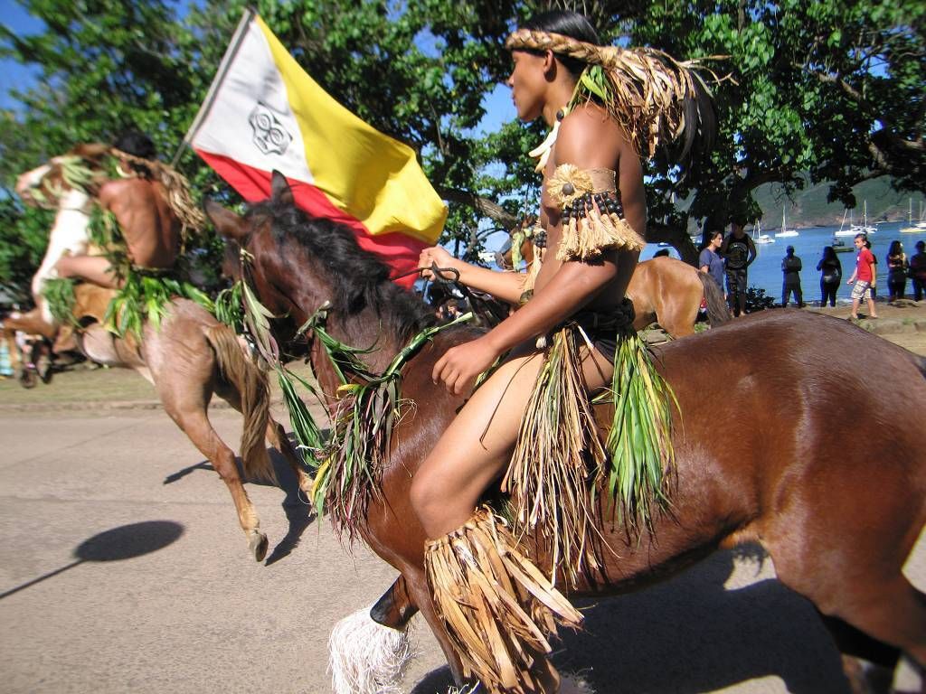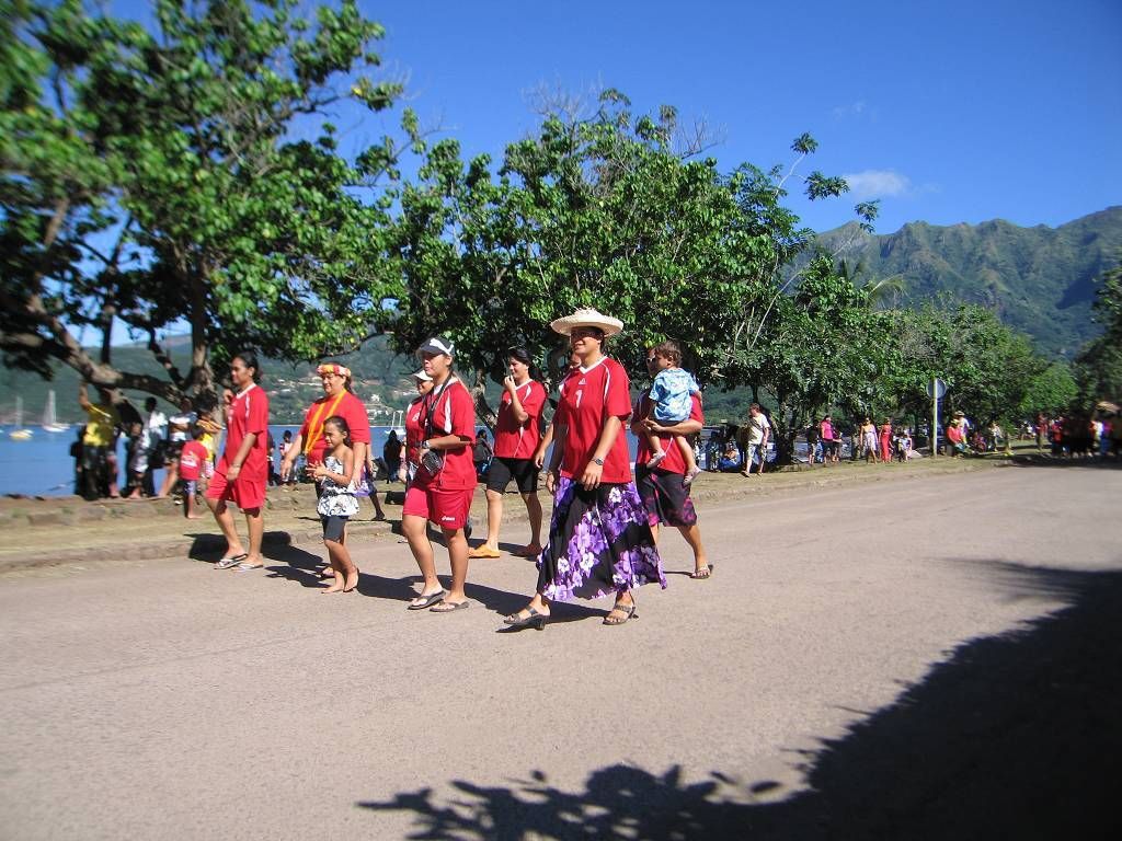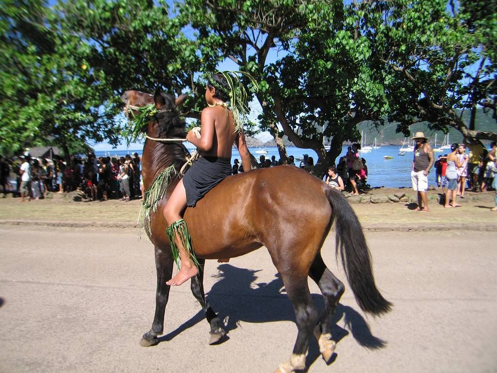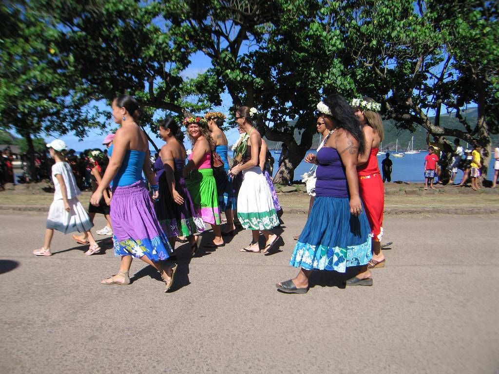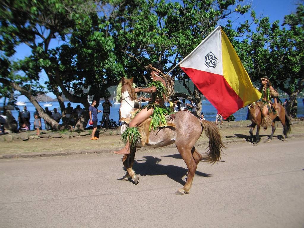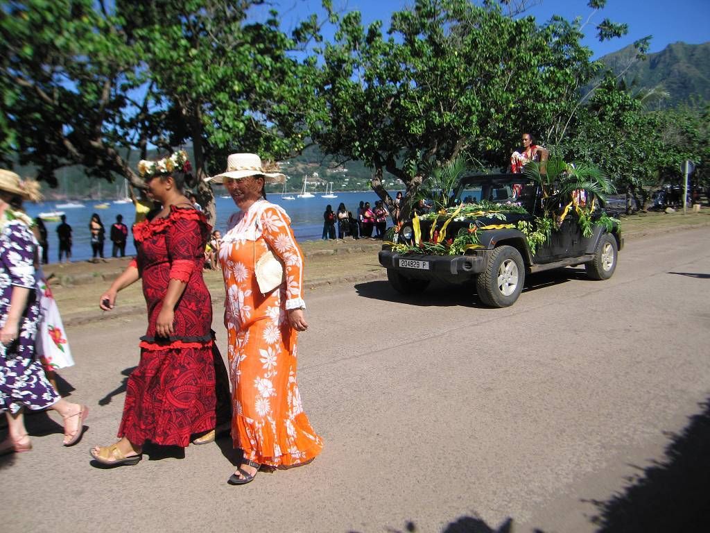 Nationalfeiertag! Es ist ein strahlend schöner Tag. Um 8h30 werden schon Blumengestecke beim Denkmal für die gefallenen Soldaten niedergelegt. So gegen 9h sind wir an Land und schon bald geht das „defilé“ los. Wir staunen nur so, wie viele Gruppen es auf dieser kleinen Insel gibt. Eine grosse Jugendgruppe ist extra aus Tahiti angereist. Es hat viele Pferde und interessante Leute. Danach gibt es eine Ansprache vom Bürgermeister, am Strand gibt es ein Pferderennen (ohne Sattel und Steigbügel), das schönste Pferd und der schönste Reiter, der schönste Wagen und die schönste Gruppe werden gekürt. Es gibt zu trinken und Kuchen zu essen. Mit den ODIN's und Anna-X essen wir später bei der Halle zu Mittag. Die Jugendgruppe aus Tahiti singt zwei Lieder und tanzt zwei moderne Tänze und danach wird die schönste Mamma gewählt. Die anderen fahren zu ihren Schiffen und Paul und ich laufen zu der Kathedrale, die im Jahre 1975 aus den Steinen von den sechs bewohnten Marquesas-Inseln gebaut wurde. Sie ist sehr schön und auch die Schnitzereien im Inneren. Um 14h20 sind wir wieder auf der MABUHAY, für eine kleine Verschnaufpause. Unterdessen findet das Pirogenrennen statt. Ein Wettrudern mit den Auslegerbooten rund um unsere Segelschiffe.