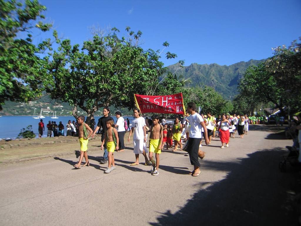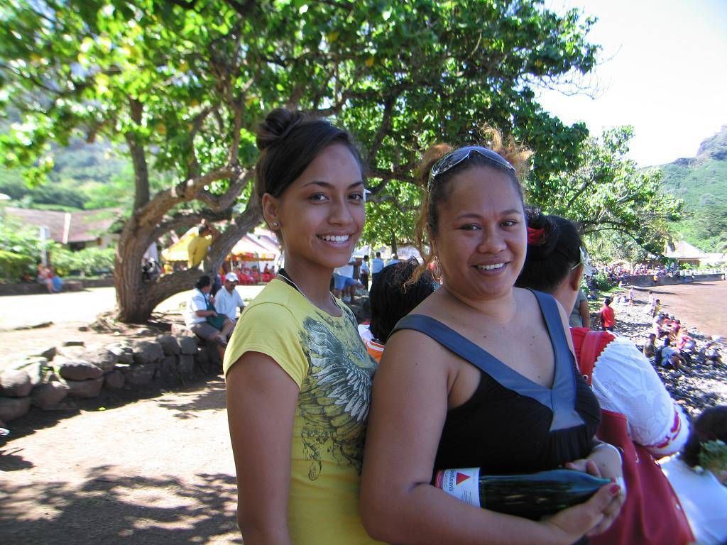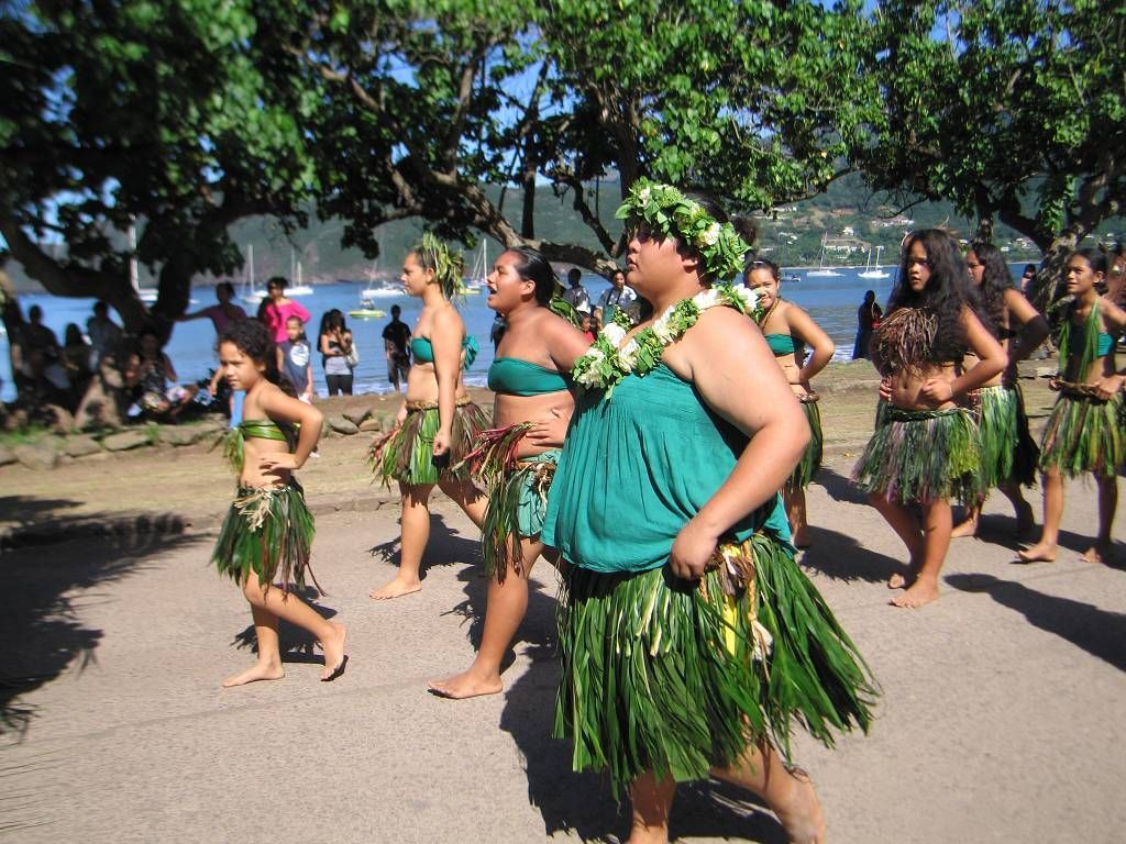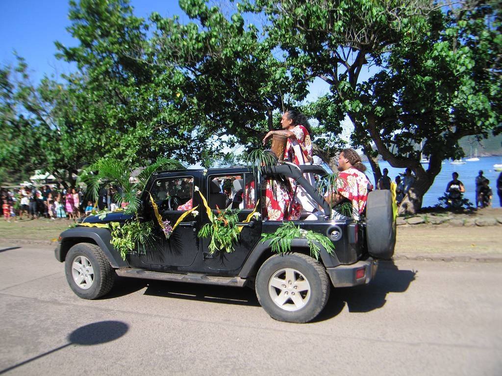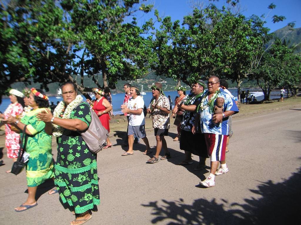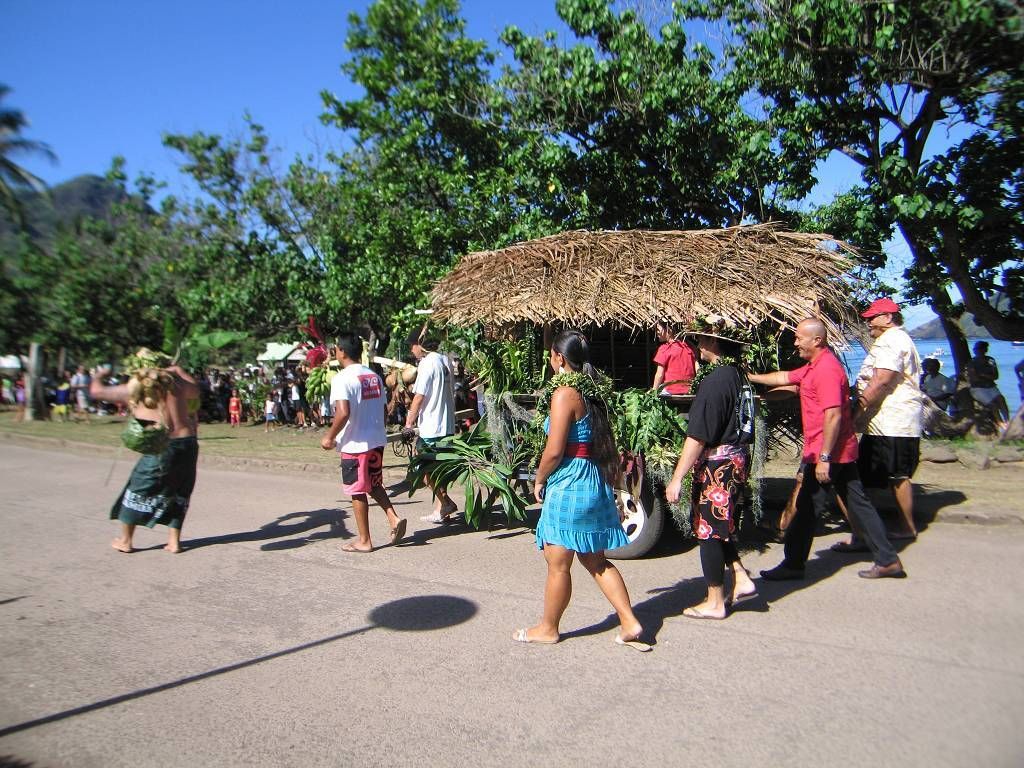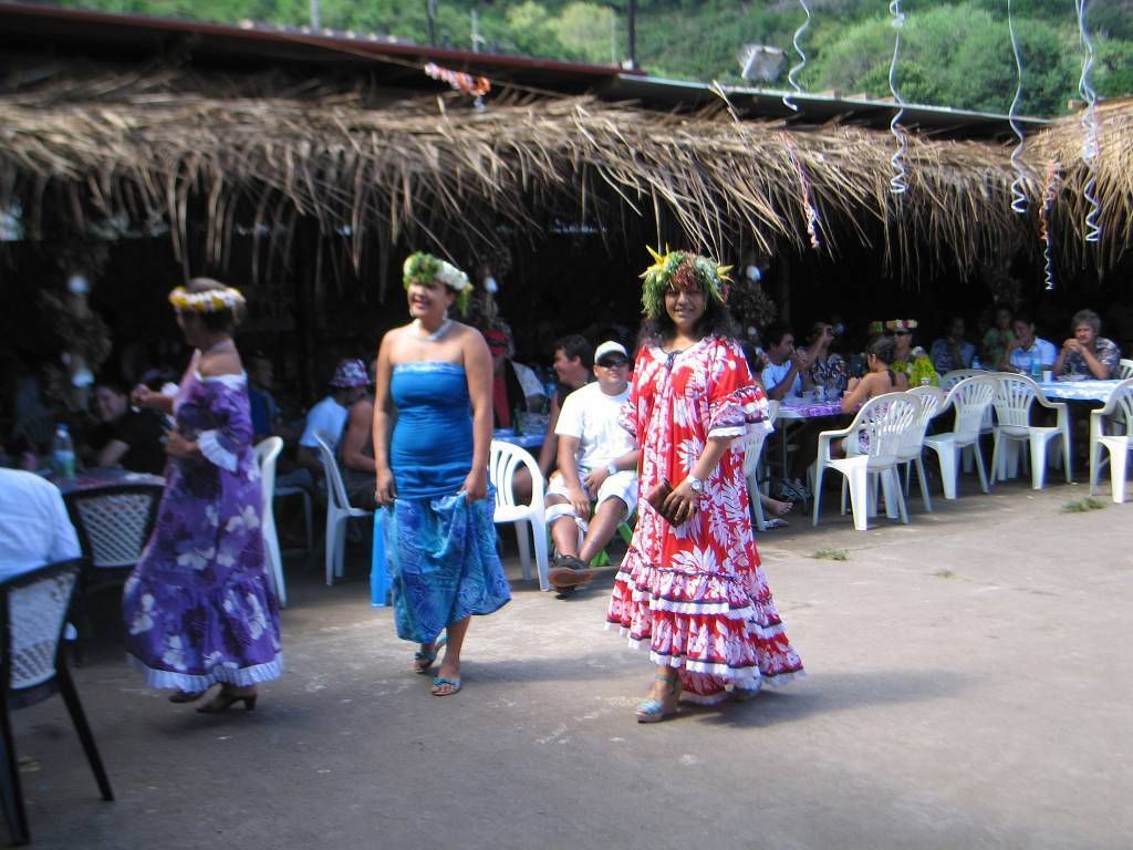 Nationalfeiertag! Es ist ein strahlend schöner Tag. Um 8h30 werden schon Blumengestecke beim Denkmal für die gefallenen Soldaten niedergelegt. So gegen 9h sind wir an Land und schon bald geht das „defilé“ los. Wir staunen nur so, wie viele Gruppen es auf dieser kleinen Insel gibt. Eine grosse Jugendgruppe ist extra aus Tahiti angereist. Es hat viele Pferde und interessante Leute. Danach gibt es eine Ansprache vom Bürgermeister, am Strand gibt es ein Pferderennen (ohne Sattel und Steigbügel), das schönste Pferd und der schönste Reiter, der schönste Wagen und die schönste Gruppe werden gekürt. Es gibt zu trinken und Kuchen zu essen. Mit den ODIN's und Anna-X essen wir später bei der Halle zu Mittag. Die Jugendgruppe aus Tahiti singt zwei Lieder und tanzt zwei moderne Tänze und danach wird die schönste Mamma gewählt. Die anderen fahren zu ihren Schiffen und Paul und ich laufen zu der Kathedrale, die im Jahre 1975 aus den Steinen von den sechs bewohnten Marquesas-Inseln gebaut wurde. Sie ist sehr schön und auch die Schnitzereien im Inneren. Um 14h20 sind wir wieder auf der MABUHAY, für eine kleine Verschnaufpause. Unterdessen findet das Pirogenrennen statt. Ein Wettrudern mit den Auslegerbooten rund um unsere Segelschiffe.