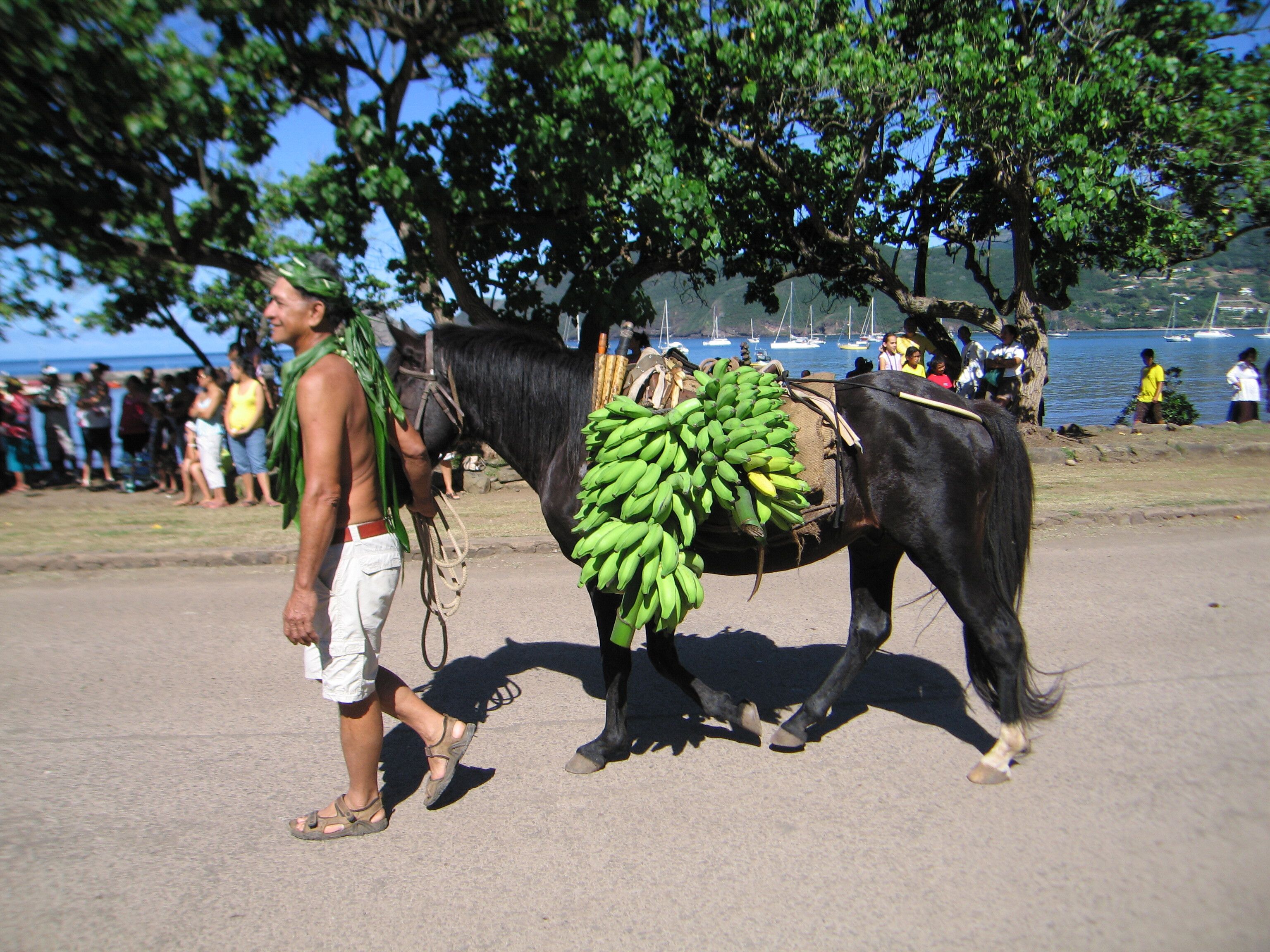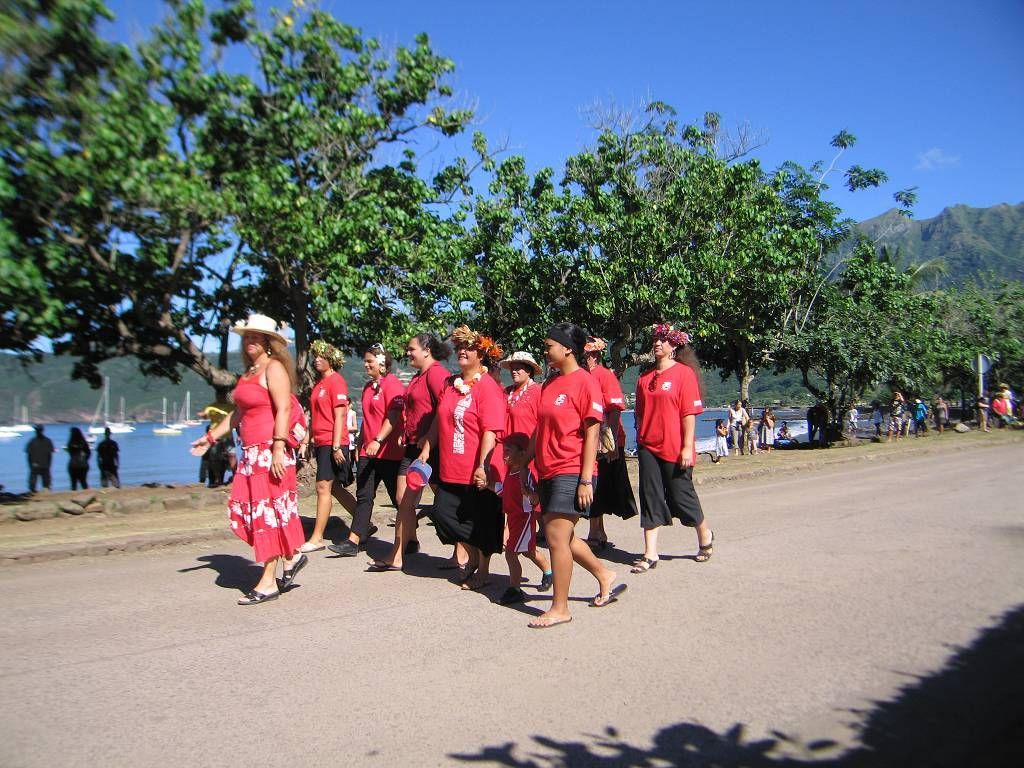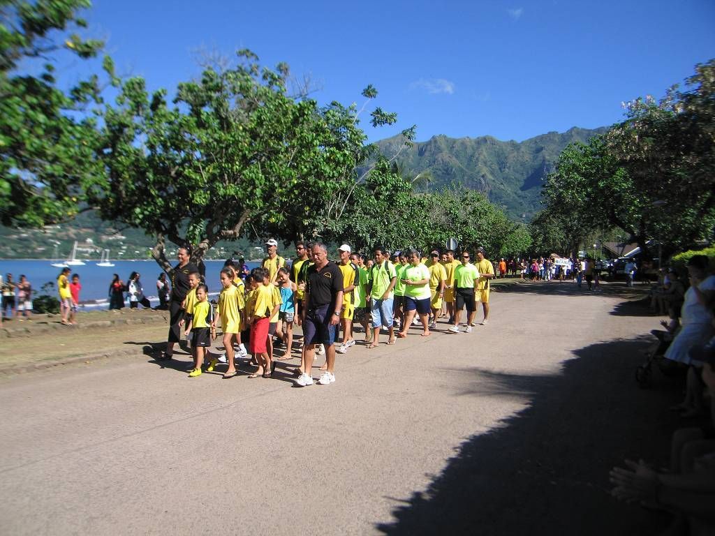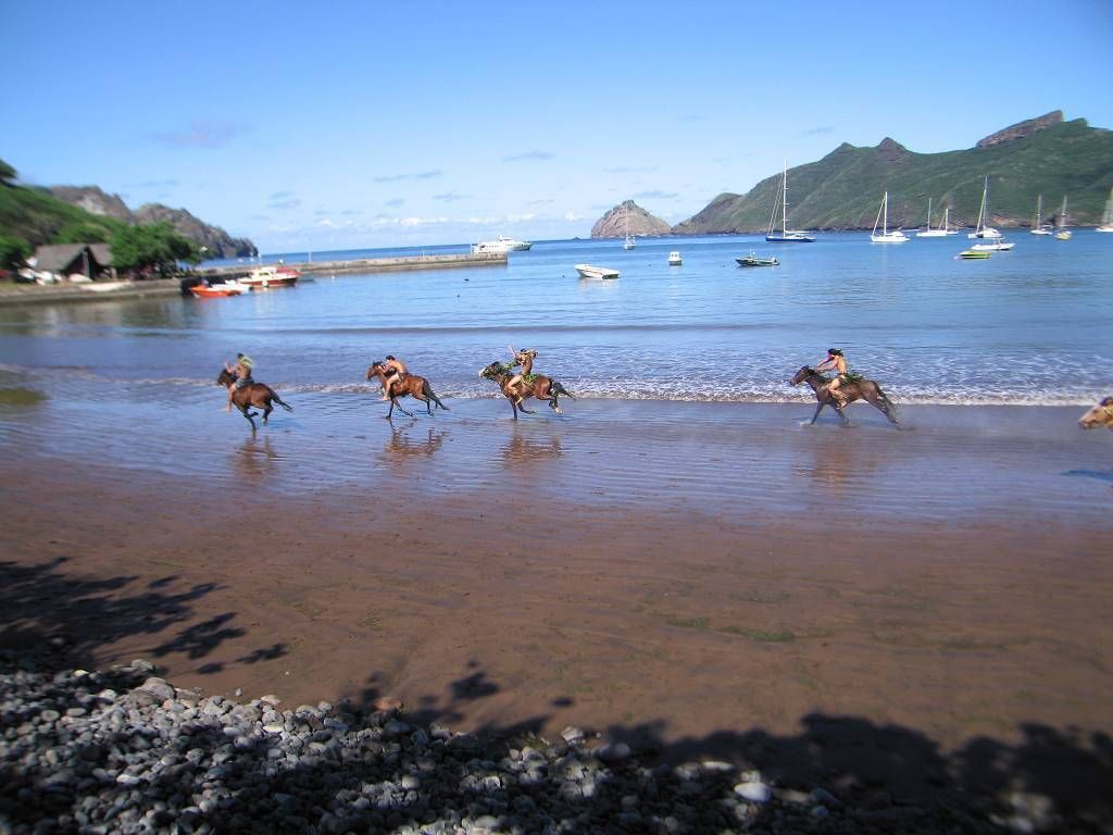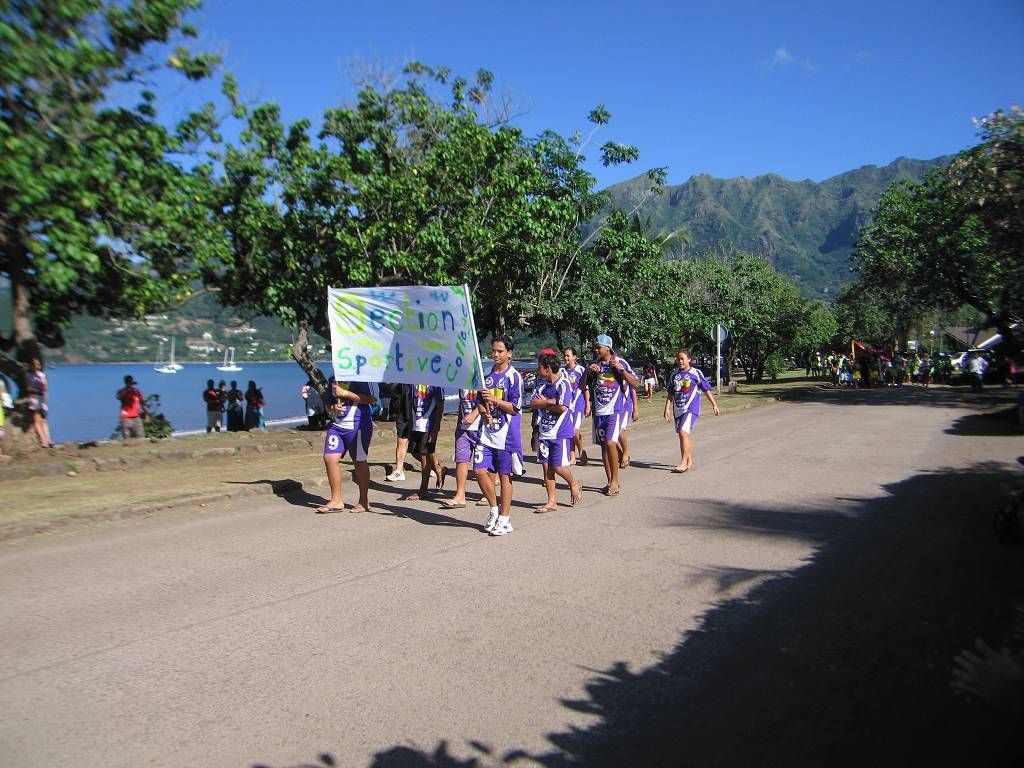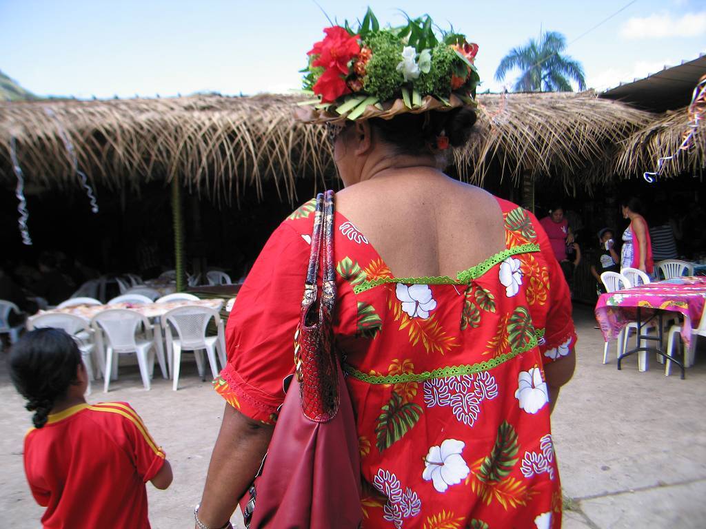 Nationalfeiertag! Es ist ein strahlend schöner Tag. Um 8h30 werden schon Blumengestecke beim Denkmal für die gefallenen Soldaten niedergelegt. So gegen 9h sind wir an Land und schon bald geht das „defilé“ los. Wir staunen nur so, wie viele Gruppen es auf dieser kleinen Insel gibt. Eine grosse Jugendgruppe ist extra aus Tahiti angereist. Es hat viele Pferde und interessante Leute. Danach gibt es eine Ansprache vom Bürgermeister, am Strand gibt es ein Pferderennen (ohne Sattel und Steigbügel), das schönste Pferd und der schönste Reiter, der schönste Wagen und die schönste Gruppe werden gekürt. Es gibt zu trinken und Kuchen zu essen. Mit den ODIN's und Anna-X essen wir später bei der Halle zu Mittag. Die Jugendgruppe aus Tahiti singt zwei Lieder und tanzt zwei moderne Tänze und danach wird die schönste Mamma gewählt. Die anderen fahren zu ihren Schiffen und Paul und ich laufen zu der Kathedrale, die im Jahre 1975 aus den Steinen von den sechs bewohnten Marquesas-Inseln gebaut wurde. Sie ist sehr schön und auch die Schnitzereien im Inneren. Um 14h20 sind wir wieder auf der MABUHAY, für eine kleine Verschnaufpause. Unterdessen findet das Pirogenrennen statt. Ein Wettrudern mit den Auslegerbooten rund um unsere Segelschiffe.