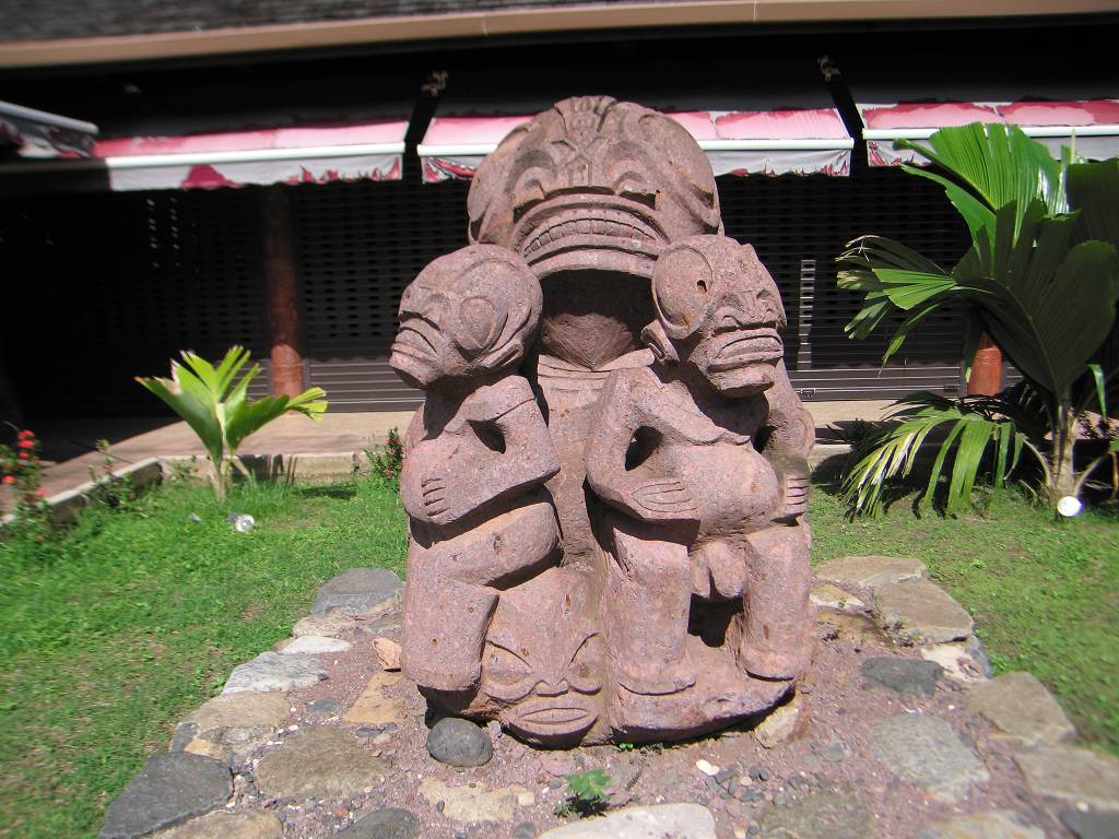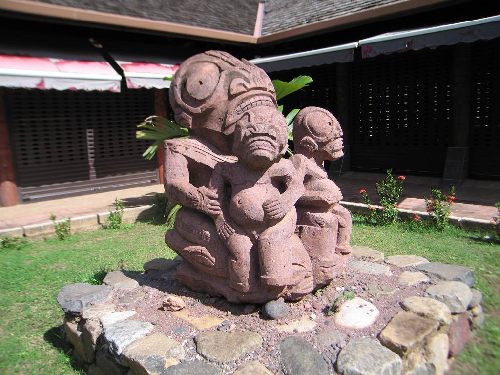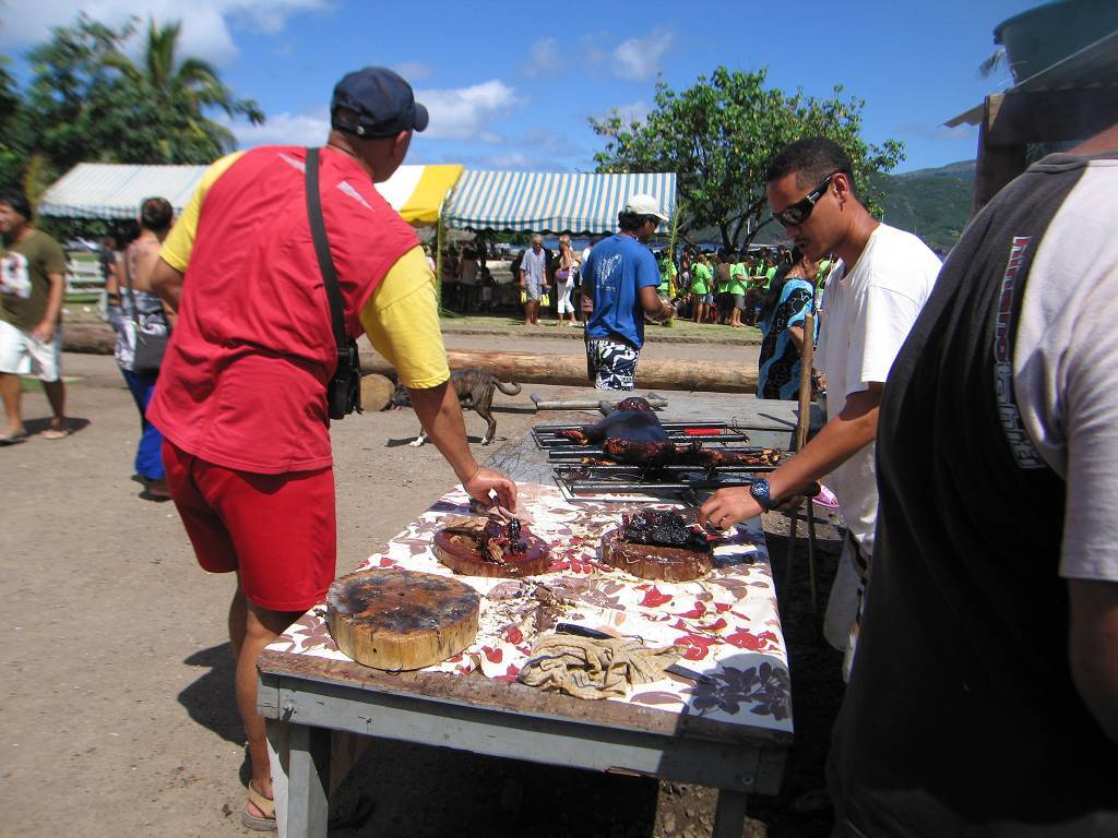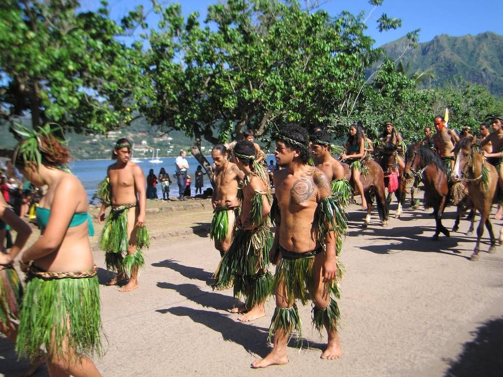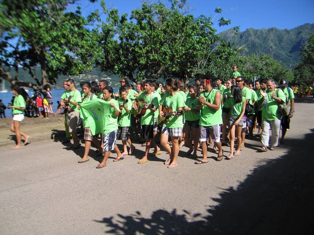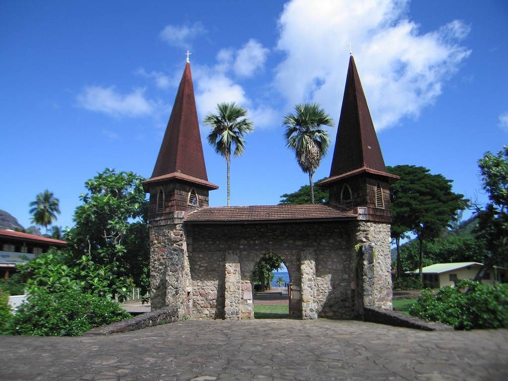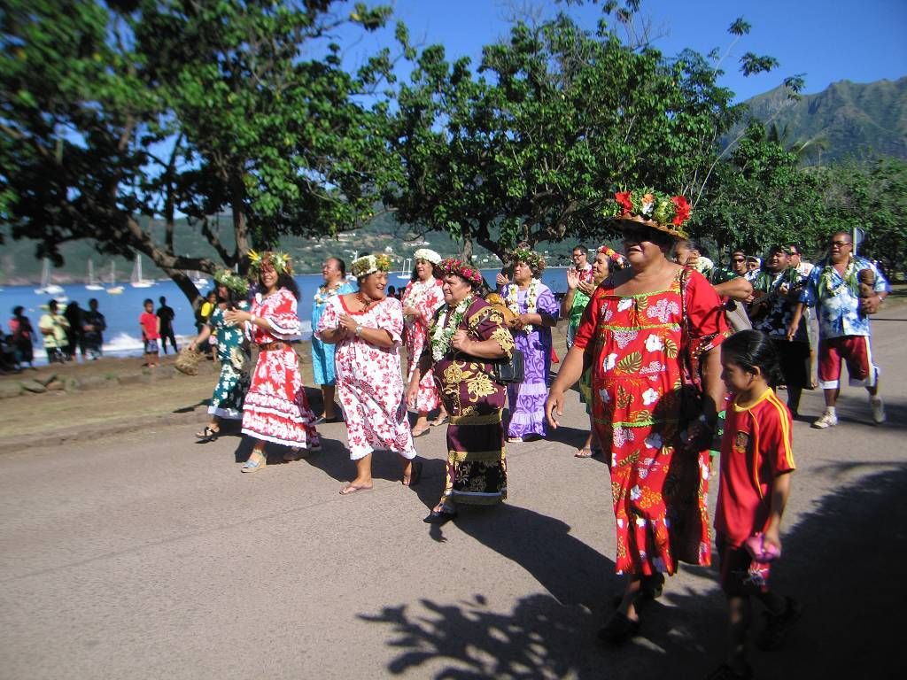 Nationalfeiertag! Es ist ein strahlend schöner Tag. Um 8h30 werden schon Blumengestecke beim Denkmal für die gefallenen Soldaten niedergelegt. So gegen 9h sind wir an Land und schon bald geht das „defilé“ los. Wir staunen nur so, wie viele Gruppen es auf dieser kleinen Insel gibt. Eine grosse Jugendgruppe ist extra aus Tahiti angereist. Es hat viele Pferde und interessante Leute. Danach gibt es eine Ansprache vom Bürgermeister, am Strand gibt es ein Pferderennen (ohne Sattel und Steigbügel), das schönste Pferd und der schönste Reiter, der schönste Wagen und die schönste Gruppe werden gekürt. Es gibt zu trinken und Kuchen zu essen. Mit den ODIN's und Anna-X essen wir später bei der Halle zu Mittag. Die Jugendgruppe aus Tahiti singt zwei Lieder und tanzt zwei moderne Tänze und danach wird die schönste Mamma gewählt. Die anderen fahren zu ihren Schiffen und Paul und ich laufen zu der Kathedrale, die im Jahre 1975 aus den Steinen von den sechs bewohnten Marquesas-Inseln gebaut wurde. Sie ist sehr schön und auch die Schnitzereien im Inneren. Um 14h20 sind wir wieder auf der MABUHAY, für eine kleine Verschnaufpause. Unterdessen findet das Pirogenrennen statt. Ein Wettrudern mit den Auslegerbooten rund um unsere Segelschiffe.