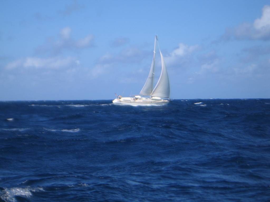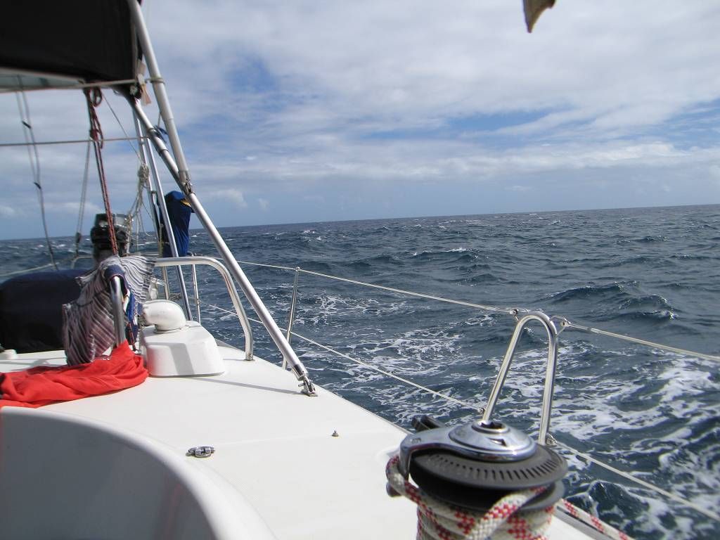 Um 05h15 ist die Schaukelei wieder so wild, dass wir beschliessen, weiterzusegeln. Zum Frühstück gibt es Kaffee (ah, das stellt auf!) und die allerletzten Bananen von unserem ganzen Strunk den wir hatten. Die beiden letzten Tage haben wir fast nur noch von Bananen und Zitronenwasser gelebt. Bei diesem Wind und 3-5 m Wellen haben wir gar nicht grosse Lust auf Essen, und ich auf's Kochen schon gar nicht! Ich lese meinem treuen Steuermann wieder Geschichtlein vor oder quatsche ihm den Kopf voll, damit er vom Müdesein abgelenkt wird. Wir erzählen uns gegenseitig Kindheitserinnerungen....