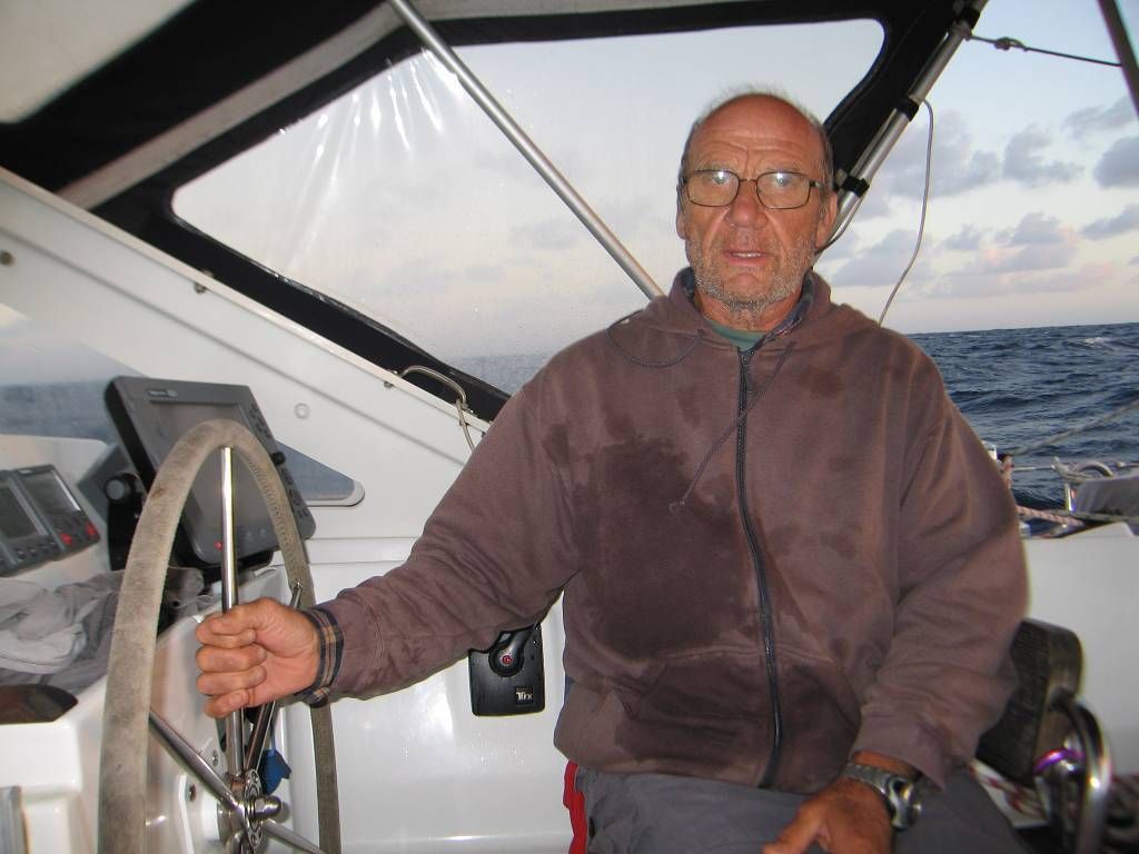 Von 00h bis 04h30 hat Paul Dienst und ich schlafe in der Bugkabine. Ab da übernehme ich wieder und Paul legt sich auf den Boden. Ein paar gewaltige Brecher fegen wieder quer durch das ganze Cockpit und der arme Paul und seine Wolldecke werden pitschnass. Ab 06h muss Paul wieder von Hand steuern. Der Kurs stimmt nicht mehr, um uns einfach treiben zu lassen. Und wir sind zu schnell, müssen „bremsen“!