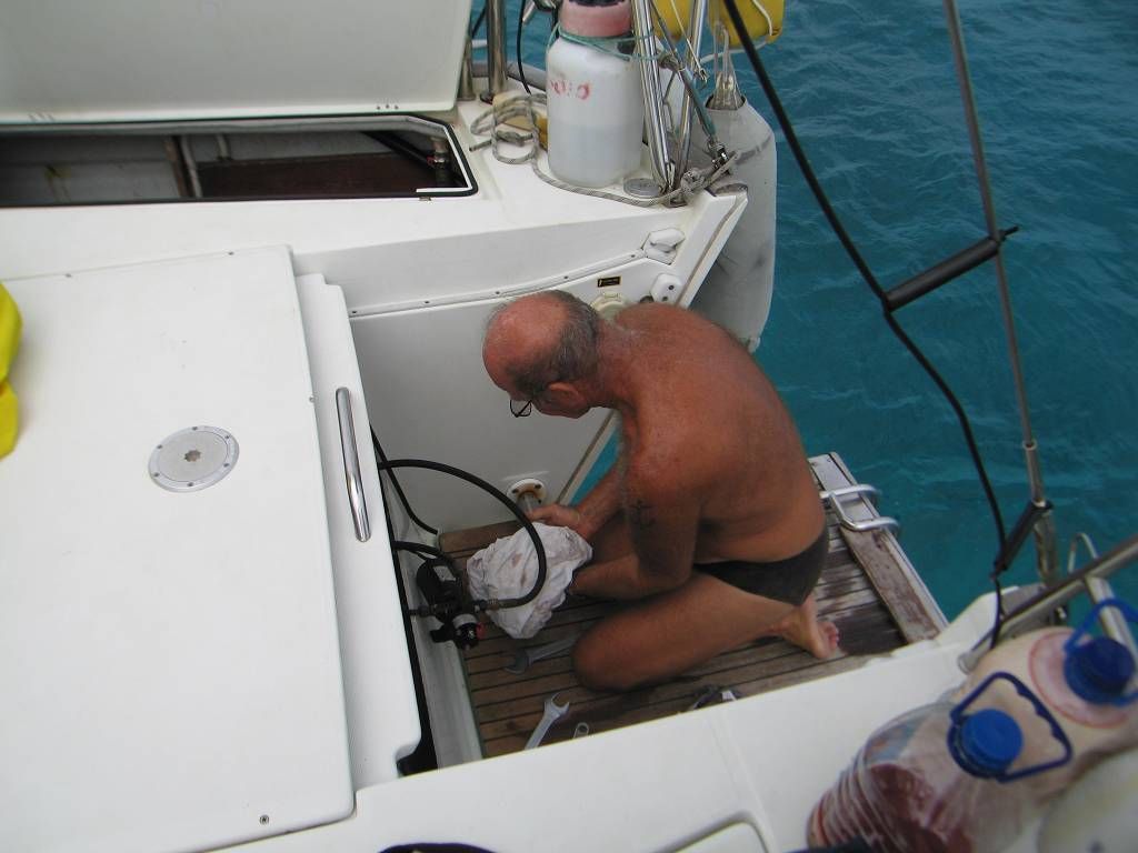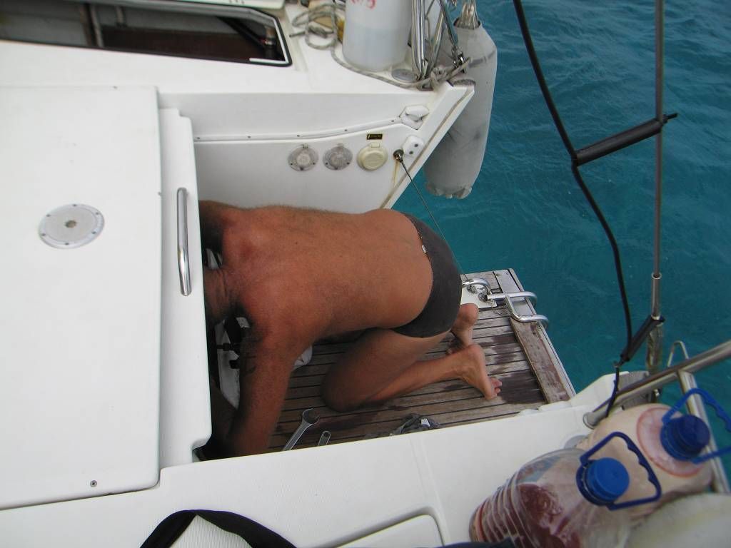 Wir suchen mühsam das Leck in den hydraulischen Leitungen. Die ganze rechte Backskiste muss ausgeräumt werden, damit Paul überhaupt an die Hydraulikpumpe kommt. Jetzt liegt das ganze Zeug vorne in der Bugkabine. Wir schöpfen literweise rosarotes, zähflüssiges Öl-Wassergemisch aus dem Schiff. Zuerst haben wir es mit einer kleinen Handpumpe versucht, aber der Ansaugschlauch ist ständig verstopft. Paul wechselt den Schlauch durch einen Dickeren aus, aber auch dieser verstopft sofort. Das Öl ist dick wie eine Emulsion. Wir finden heraus, dass es am besten mit der Saucenkelle aus der Küche geht. Paul reisst das Bett in unserem Schlafzimmer ausseinander und auch da drunter befindet sich die Ölsauce. Wenn wir nach draussen, ins herrlich blaue Wasser schauen, sehen wir 10 bis 12 kleine Haie kreisen...., sie sind etwa 1m lang, weiss und haben schwarze Flossen. Sind es Schwarzspitzenriffhaie? Vermutlich nicht. Beim genaueren Hinschauen, sehen wir, dass sie ganz platte Köpfe haben. Vermutlich sind es „nur“ Schiffshalter.