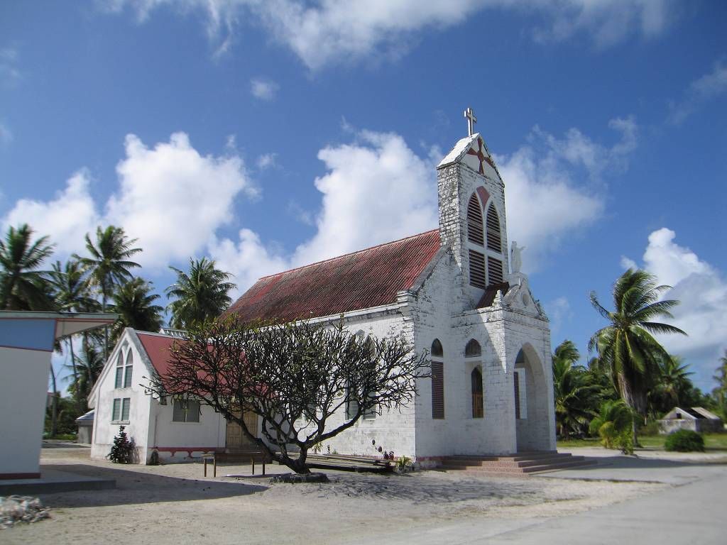 Es ist ein wunderbar sonniger Morgen. Um 08h sind wir in der katholischen Kirche und diesmal werden wir nicht enttäuscht. Die Kirche ist schön mit Blumen geschmückt und es hat viele Kinder. So wie es aussieht, ist Edouard der Siegrist, er begrüsst uns persönlich mit Handschlag. Die vier Laienpriester in weissen Kleidern und die vier Ministranten, zwei Mädchen, zwei Knaben, tragen alle Blumenkränze um den Hals. Zu Ukulele-, Gitarren- und Trommelklängen wird herzergreifend gesungen. Zwar ist es nicht besonders perfekt, aber alle sind mit vollem Einsatz dabei. Mich juckt es, auch mitzusingen, aber welchen Text? Ich kann immer noch kein Polynesisch. Der ganze Gottesdienst findet in dieser Sprache statt.
