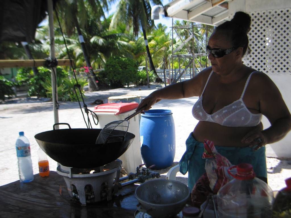 Wir spazieren weiter und genehmigen uns im Dorfladen, von dem man uns gesagt hat, er sei immer nur abends ab 17h geöffnet, eine Glacé. Der Dorfladen gehört übrigens dem Gemeindepräsidenten, dem auch eine der nur noch zwei Perlfarmen für schwarze Perlen gehört. Bei der Schwester des Gemeindepräsidenten bestellen wir für 12h zwei Mal Frites mit Steak. Gemüse oder Salat hat es keines mehr. Nun spazieren wir bis zum Aussenriff des Atolls, wo das Meer zünftig ans Land schlägt. Pünktlich zum Mittagessen sind wir wieder beim Dorfladen. Das Getränk zu unserem Essen müssen wir im Laden kaufen und dann essen wir draussen unter einem Schattendach das Steak mit Frites. Die Köchin kocht und bewirtet uns im weissen BH! Aber sie ist sehr nett und erzählt uns viel Wissenswertes über die Insel.