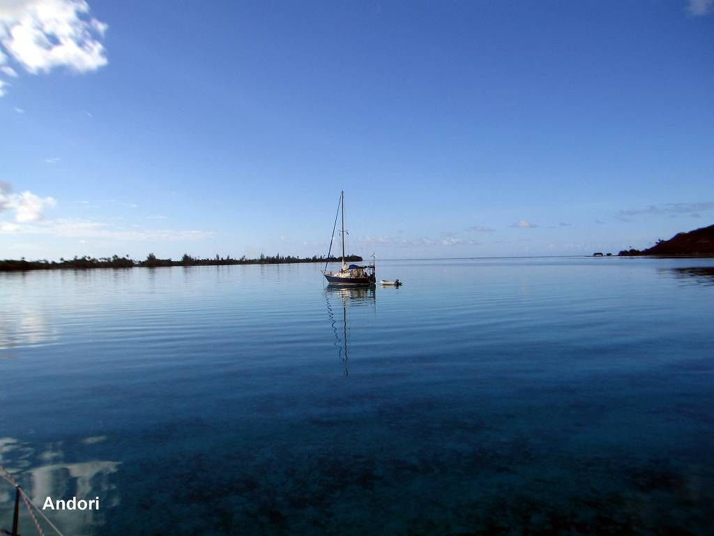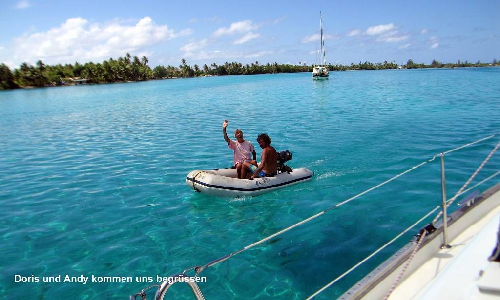 Gegen Morgen werden nochmals etwa 2 Stunden dümpelnd verbracht. Die Einfahrt in den Pass ist sehr einfach und um 11h15 lassen wir den Anker in der Lagune hinter dem Motu (Riff-Insel) Murimahora in glasklares, unverschämt türkisblaues Wasser fallen. Diese Lagune befindet sich auf der Ostseite der Insel Huahine Iti, dem kleineren Teil der zweigeteilten Insel Huahine. Es sind zwei Schiffe hier. Die Österreicher „Molimentum“, die wir nicht kennen und die Schweizer „Andori“. Andy kommt uns mit dem Dinghy entgegen um uns auf die untiefen Stellen aufmerksam zu machen. Nach dem Ankern gibt es auf der MABUHAY einen Anker-Empfangs-Trunk.