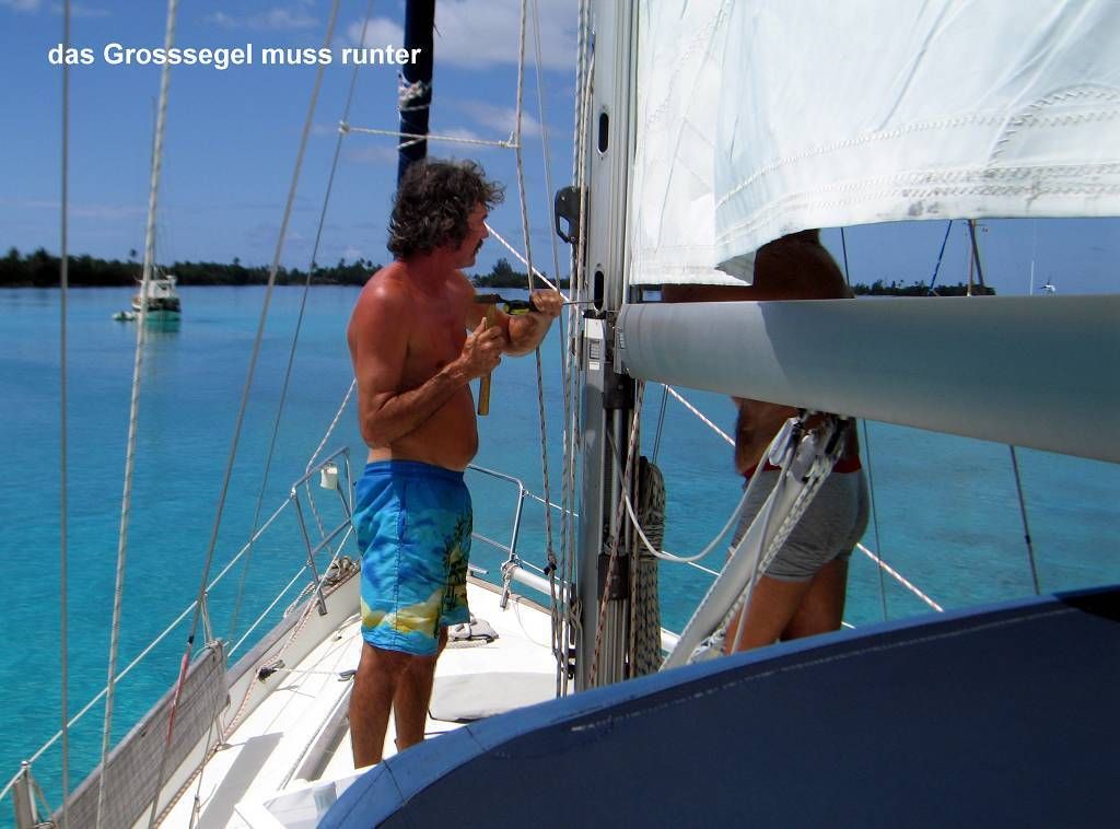 Um 9h45 kommt Andy und hilft uns, das Grosssegel herunter zu nehmen. Dazu müssen Paul und Andy eine Schraube aufbohren, die total korrodiert ist. Es hat keinen Wind. Wir stellen fest, dass noch an einer anderen Stelle die Naht aufgegangen ist. Wir finden das einfach nicht normal. Das Segel ist 20 Monate alt und von North-Sails, also kein alter oder billiger Fetzen!!! Paul und ich nähen von Hand, mit einer dicken Nadel und gewachstem Faden die zwei Stellen, wo die Naht aufgegangen ist. Jetzt fädeln die Männer das Segel wieder ein und ich muss an der Winsch drehen, bis das Segel wieder zuoberst ist. Danach gibt es für die Männer ein kühles Bier. Paul und ich sind uns nicht sicher, ob wir alle Nähte des Segels bei einem Segelmacher nachnähen lassen sollen, oder ob die Nähte bis Neuseeland halten.