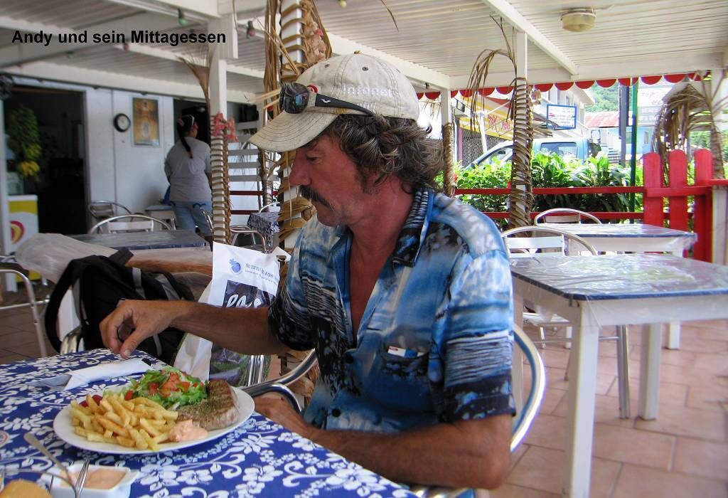 Danach essen wir bei „Chez Guynette“ auf der Terrasse am Meer zu Mittag. Es gibt sehr gute Thunfisch-Steaks (Paul nimmt Würstchen) dazu Frites und Salat. Um 13h machen wir uns schon wieder auf den Rückweg. Wer weiss, wie lange es dauert, bis wir endlich wieder mitgenommen werden. Aber, schon der allererste Pickup hält an. Direkt neben der Gendarmerie. Wir klettern alle vier auf die Ladefläche (das ist hier streng verboten!) und geniessen die luftige Fahrt durch die schöne Gegend. Nach etwa 5km hält der Fahrer schon an und sagt uns: „So, wir sind hier zu Hause, bitte aussteigen“. Wir schauen alle so verdutzt drein und bleiben einfach sitzen, dass der Mann sagt: “O.K. Wir fahren euch bis zu euerem Ziel“. Wir können es kaum fassen und freuen uns wie die Kinder. Doris steigt nun vorne zu dem Ehepaar ein. Wir werden bis zu unserem Dinghy gebracht, bestimmt noch ganze 10km weiter, und das muss das Ehepaar auch wieder zurückfahren. Wir erfahren von den beiden, dass gestern bei dem „Hochwasser“ am Südende der Insel zwei Hotels beschädigt wurden, weil die Bungalows überflutet wurden. Zum Abschied schenken wir den netten Leuten 2 Tafeln Schokolade, die wir eben erst im Supermarkt gekauft hatten.