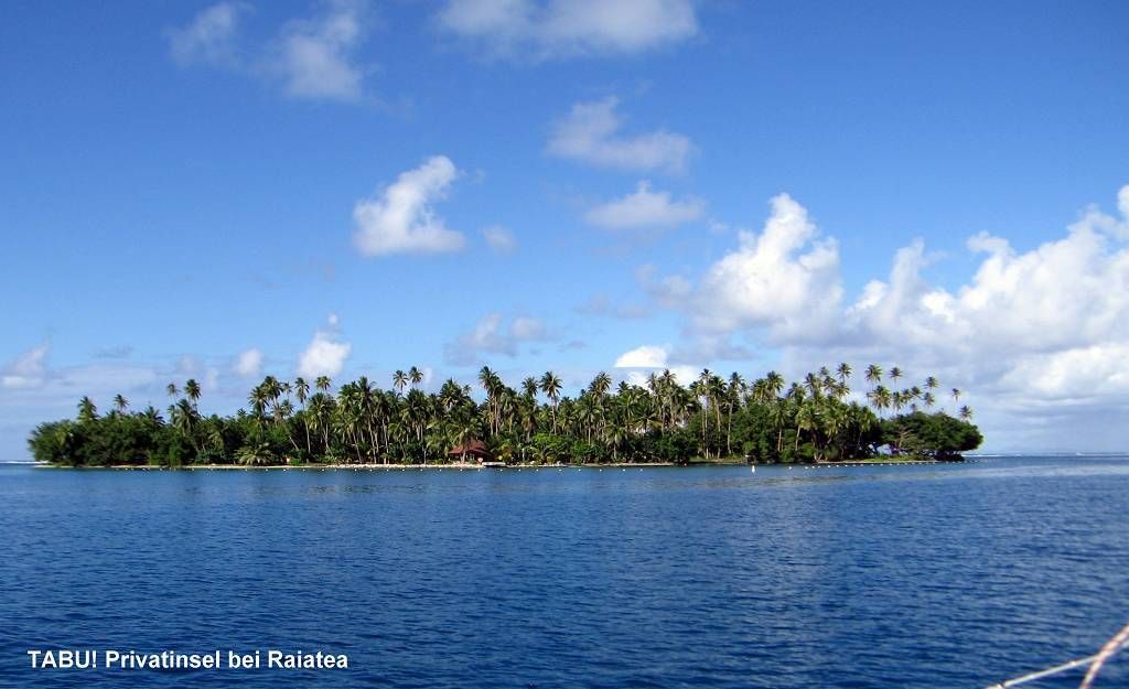 Das Meer ist flach und die 3-5 Knoten Wind (angesagt waren viel mehr) kommen aus allen Richtungen. Um 15h erreichen wir unser Ziel, die Insel Raiatea. Hier ankern wir direkt hinter der Passeinfahrt, bei einer privaten Insel. Rund um die Insel sind grosse, rote Tafeln aufgestellt, wo draufsteht: TABU, privé !!!