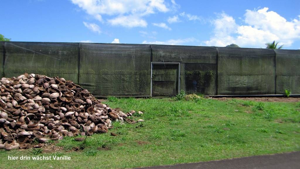 Um 11h sind wir bereits an Land und spazieren ein wenig herum. Wir kaufen bei einer Vitrine an der Strasse 24 Bananen für ca, 2 Franken. Wir kommen an schattierten Gewächshäusern vorbei, wo Vanille wächst. Und überall hat es Blumen in allen Farben. Hier gefällt es uns! Die Sonne scheint, es weht eine leichte Brise, alle Leute sind sehr freundlich, die Lagune leuchtet in allen Blautönen und es hat sehr wenig Autoverkehr. Wir beide sind uns unisono einig, so muss die Südsee sein! In einem schönen privaten Garten essen wir bei einer „Roulotte“ (fahrende Küche) die aber fest hier stationiert ist, zu Mittag. Auch hier überkommt uns das „Südseefeeling“. Die Besitzerin bedient uns in einem Pareo (buntes Wickeltuch) und offenen langen Haaren. Sie stellt uns ihren Eltern vor. Die Mamma trägt ein Blumenkränzchen auf dem Kopf und hat nicht mehr sehr viele Zähne im Mund. Aber sie strahlt!