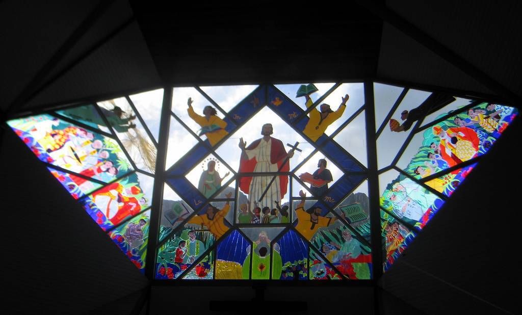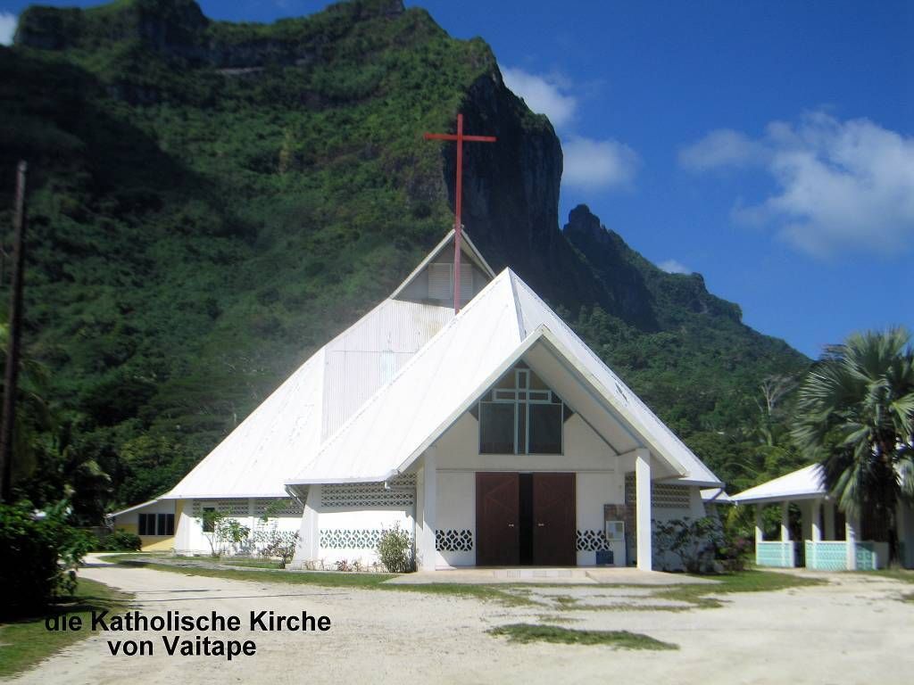 Wir stehen früh auf, schon um 6h45! Um 7h50 sind wir in der katholischen Kirche von Vaitape. Man hat uns gesagt, die Messe beginne um 8h. Aber das stimmt nicht, es geht erst um 8h30 los. Aber die halbe Stunde die wir bereits in den Bänken sitzen, vergeht wie im Fluge. Wir schauen zu, was da alles vorbereitet wird und bestaunen die Leute. Das ist sehr interessant! Durch das bunte Glasfenster sieht man direkt auf den mächtigen Berg der Bora Bora dominiert.