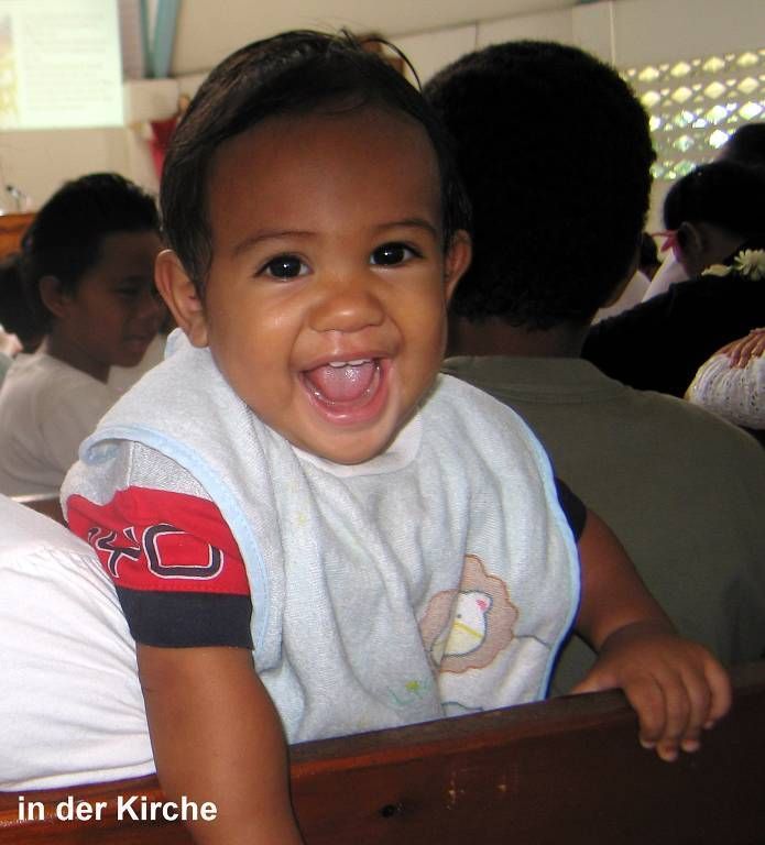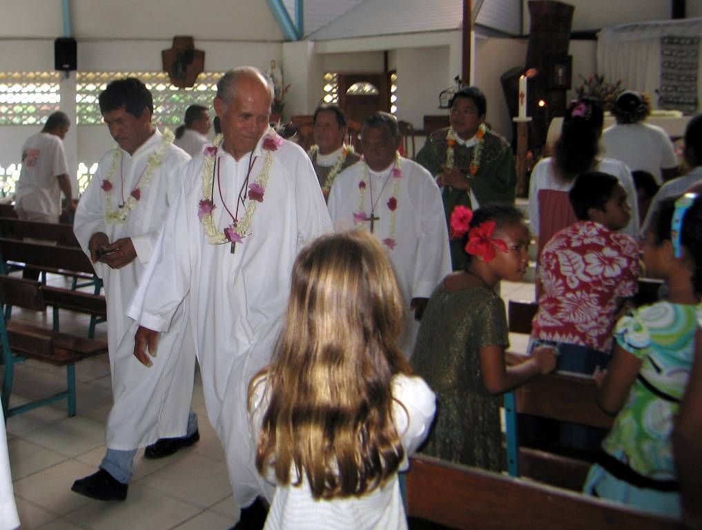 Die Messe ist sehr abwechslungsreich und unterhaltsam. Ein Chor aus Kindern wird von einer (vermutlichen) Lehrerin dirigiert. Begleitet werden sie von Trommeln und Gitarren. Beim „Allelujalied“, wo abwechselnd die Mädchen und die Knaben „Alleluja“ singen, verpassen die Knaben ihren Einsatz. Aber das macht nichts, dafür sind sie dann mit umso mehr Eifer dabei und es tönt wirklich schön. Die Messe, Predigt und Lieder werden zweisprachig gehalten, Polynesisch und Französisch.